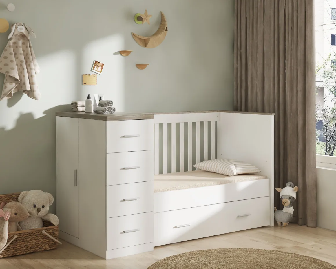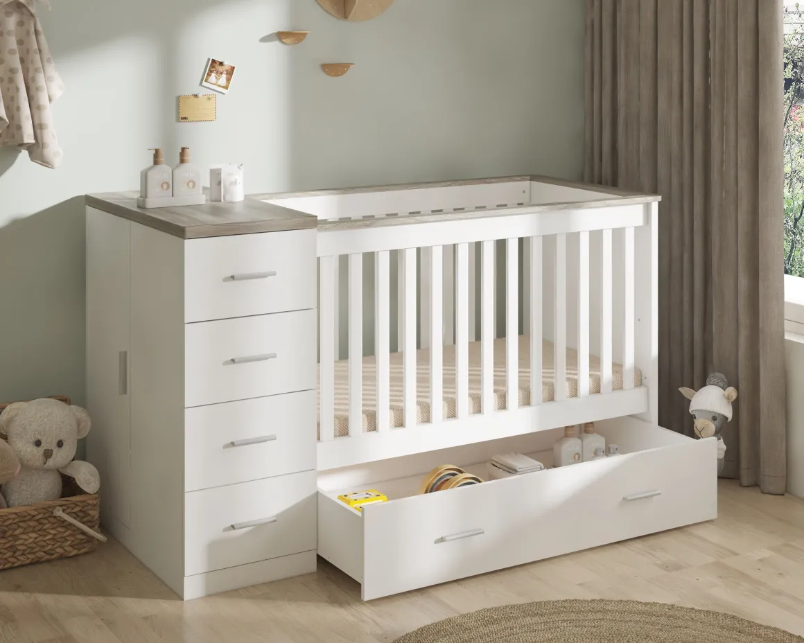 Heb je weinig ruimte in de babykamer? Born Lucky Combi Ledikant Memphis Wit Grijs past perfect in iedere ruimte, ook in een kleine babykamer! Het combi ledikant is een baby bedje, commode en kledingkast in één. Het biedt biedt alle gemakken van een complete babykamer, zonder dat het veel ruimte in beslag neemt.