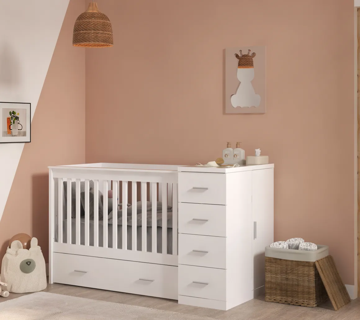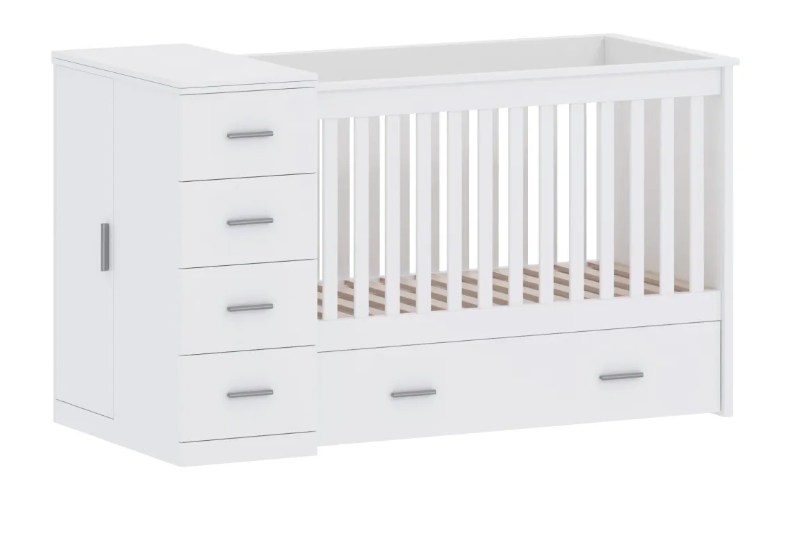 Heb je weinig ruimte in de babykamer? Born Lucky Combi Ledikant Memphis Wit past perfect in iedere ruimte, ook in een kleine babykamer! Het combi ledikant is een baby bedje, commode en kledingkast in één. Het biedt biedt alle gemakken van een complete babykamer, zonder dat het veel ruimte in beslag neemt.