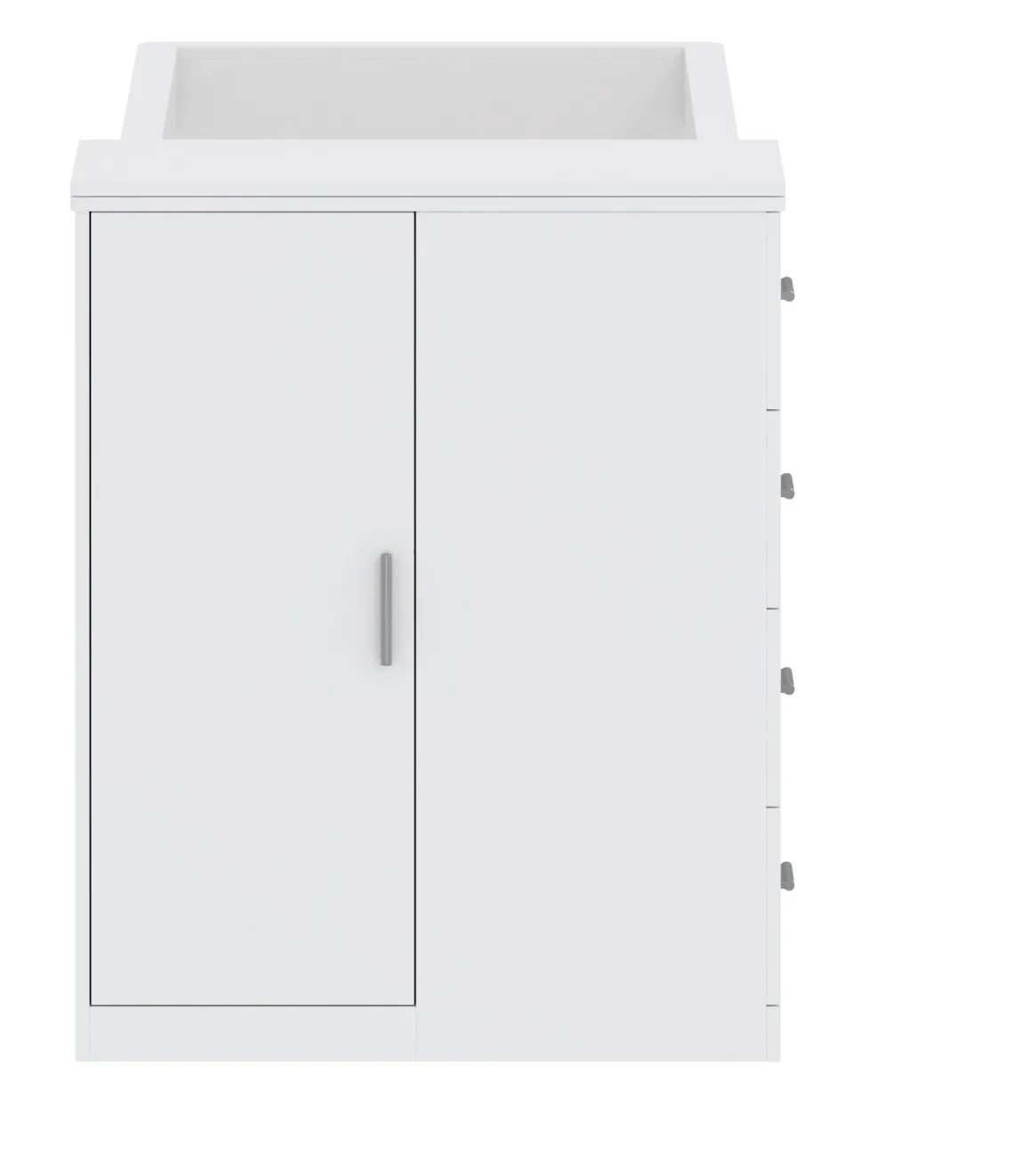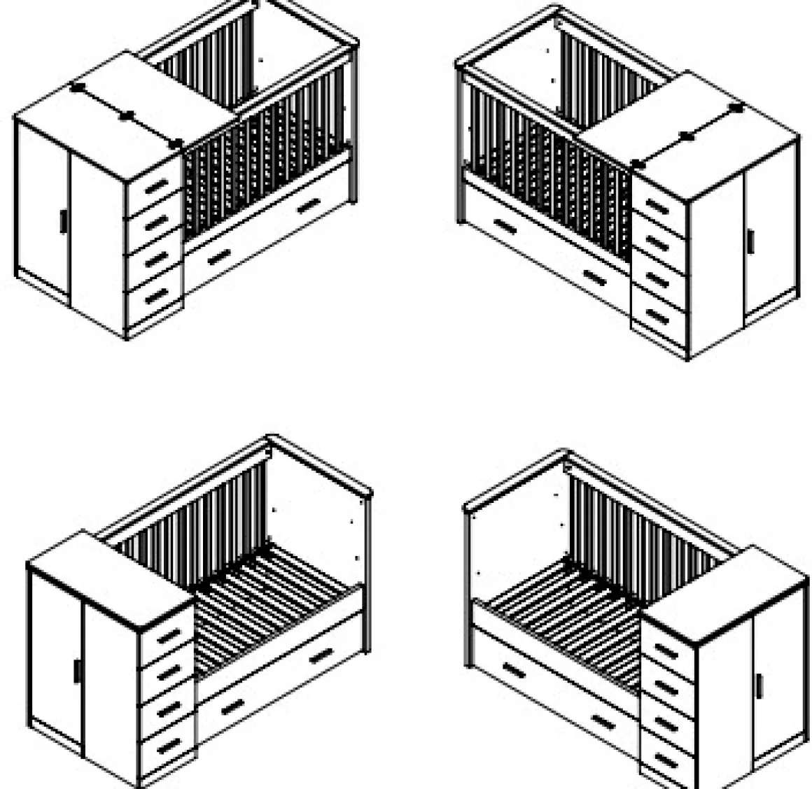 Aan de zijkant van het baby bed zit een ladeblok met 4 opberglades. Onder het bed bevindt zich een extra opberglade. Achter het ladeblok zit een ingebouwde kledingkast met hang- en leggedeelte. Het ladeblok kan zowel links als rechts worden gemonteerd.