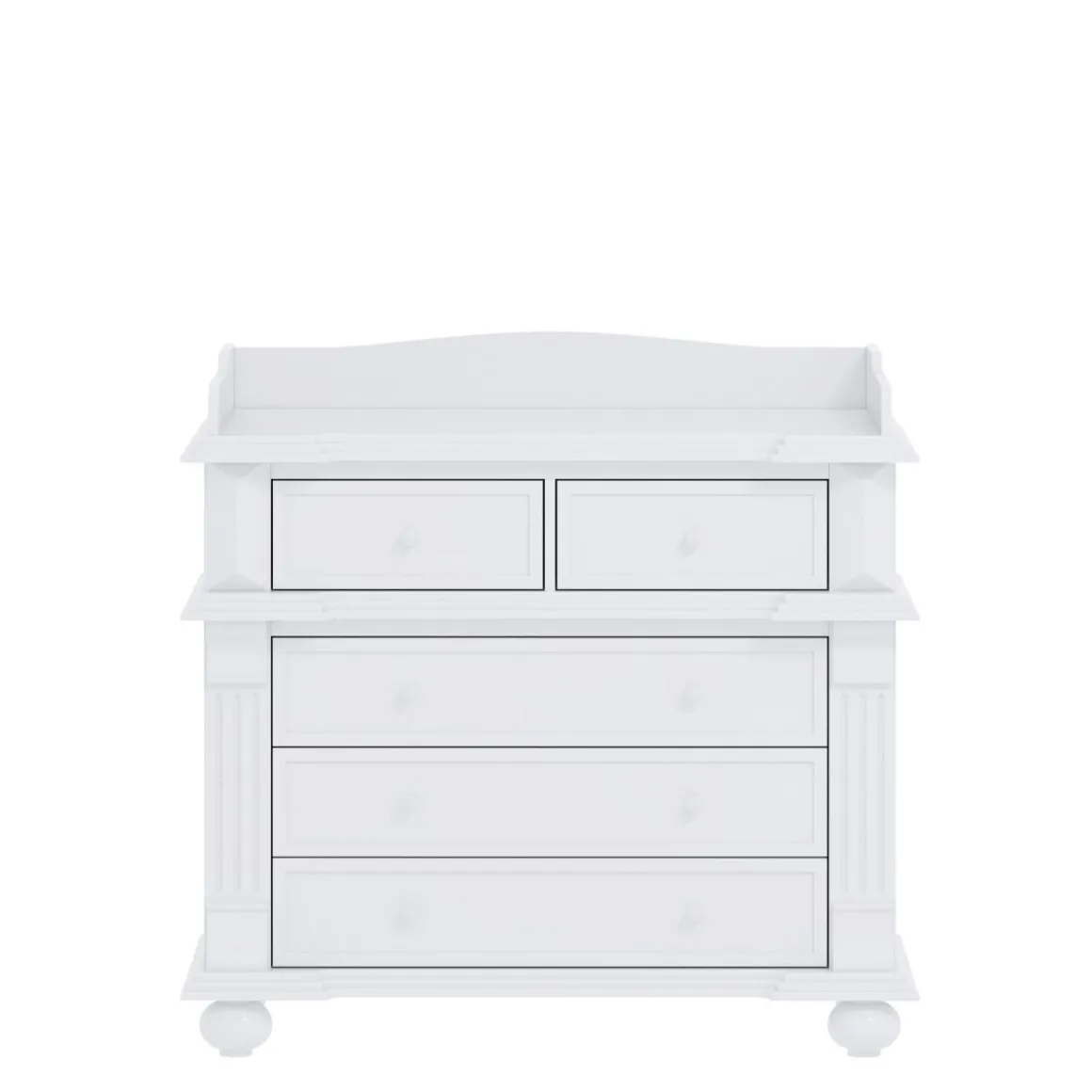 De ruime klassieke commode heeft 5 opberglades. In de 3 brede lades en 2 smalle lades kunnen alle babyspullen overzichtelijk worden opgeborgen. Op het ruime commodeblad heb je voldoende ruimte voor het verschonen, verzorgen en aankleden van je kindje.