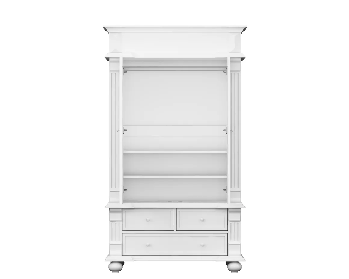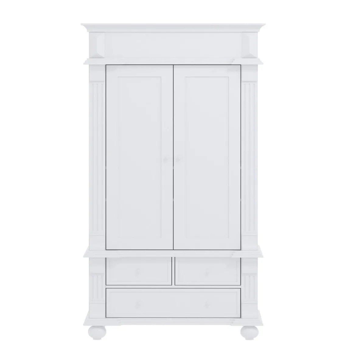 De witte klassieke kledingkast heeft een tijdloos uiterlijk, waardoor je er lang plezier van zal beleven. De romantische en sierlijke details maken de kast uniek en een echte eyecatcher voor in de babykamer.
