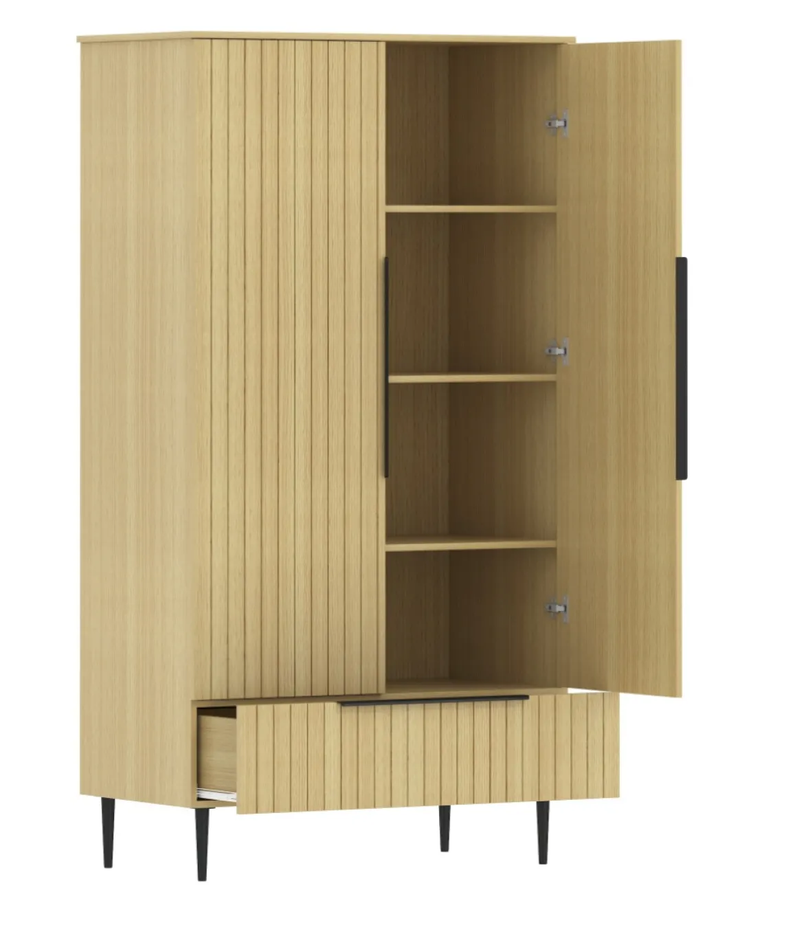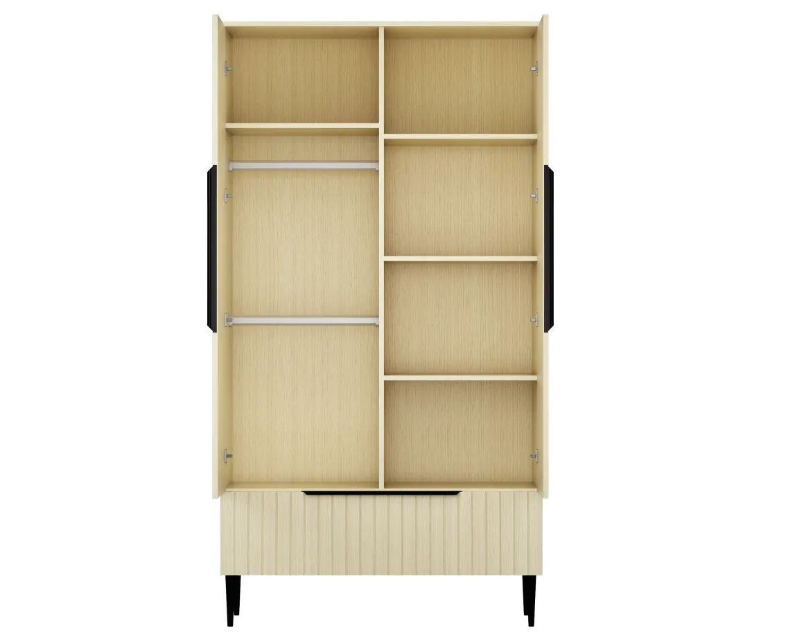 De kledingkast heeft een natuurlijke uitstraling. De fronten van de kast hebben een stijlvol reliëf patroon. De kledingkast is afgewerkt met stoere details, zoals de zwarte handgrepen en de zwarte pootjes. Met de kledingkast in de babykamer heb je altijd voldoende opbergruimte!