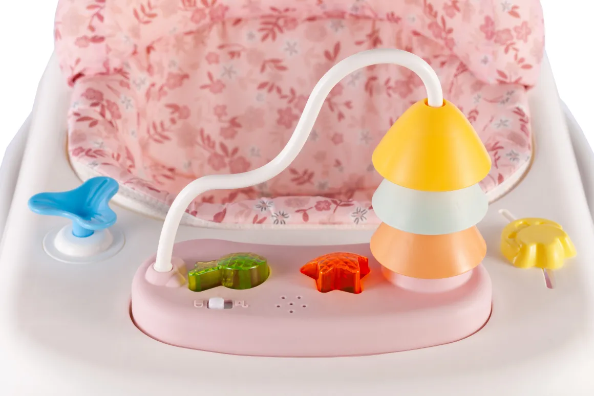 De loopstoel is voorzien van een vrolijk speelblad met leuke activiteiten die het gehoor, zicht en de fijne motoriek stimuleren. Door de kleurrijke knoppen en geluidjes blijft je kindje nieuwsgierig en betrokken. Bovendien kan het speelblad vaak worden verwijderd, zodat de loopstoel ook gebruikt kan worden als eetstoeltje of voor rustige momenten.