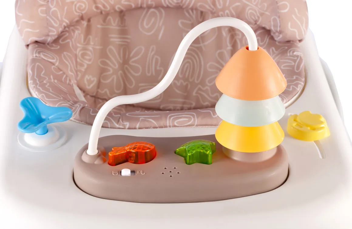 De loopstoel is voorzien van een vrolijk speelblad met leuke activiteiten die het gehoor, zicht en de fijne motoriek stimuleren. Door de kleurrijke knoppen en geluidjes blijft je kindje nieuwsgierig en betrokken. Bovendien kan het speelblad vaak worden verwijderd, zodat de loopstoel ook gebruikt kan worden als eetstoeltje of voor rustige momenten.