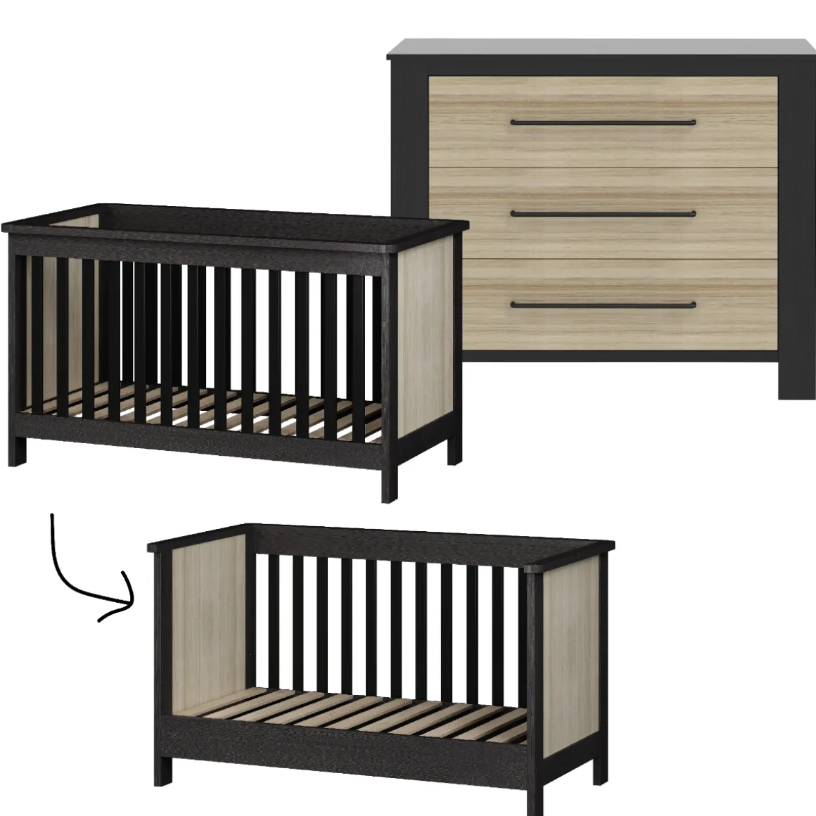Meegroei babykamer Oxford is een duurzame investering voor in de toekomst. Het eigentijdse meegroei ledikant kan namelijk worden omgebouwd van baby bed tot peuterbed, waardoor het geschikt is vanaf de geboorte tot een leeftijd van 5 jaar. De commode biedt een fijne plek voor het opbergen van babyspulletjes en het verschonen van je kindje.