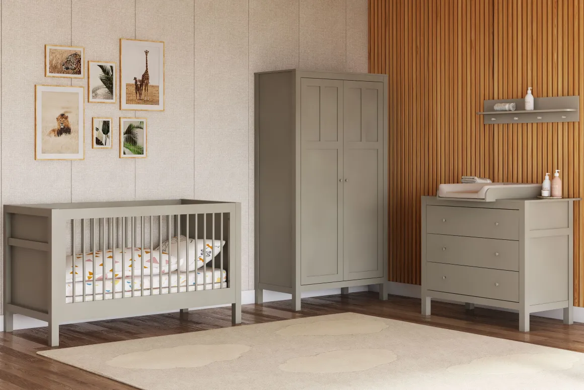 Born Lucky meegroei babykamer Stanton bestaat uit een meegroei ledikant, een ruime commode met drie lades en een kledingkast met hang- en leggedeelte. De meubels zijn uitgevoerd in een zachte, neutrale kleur die perfect past in iedere babykamer.Â