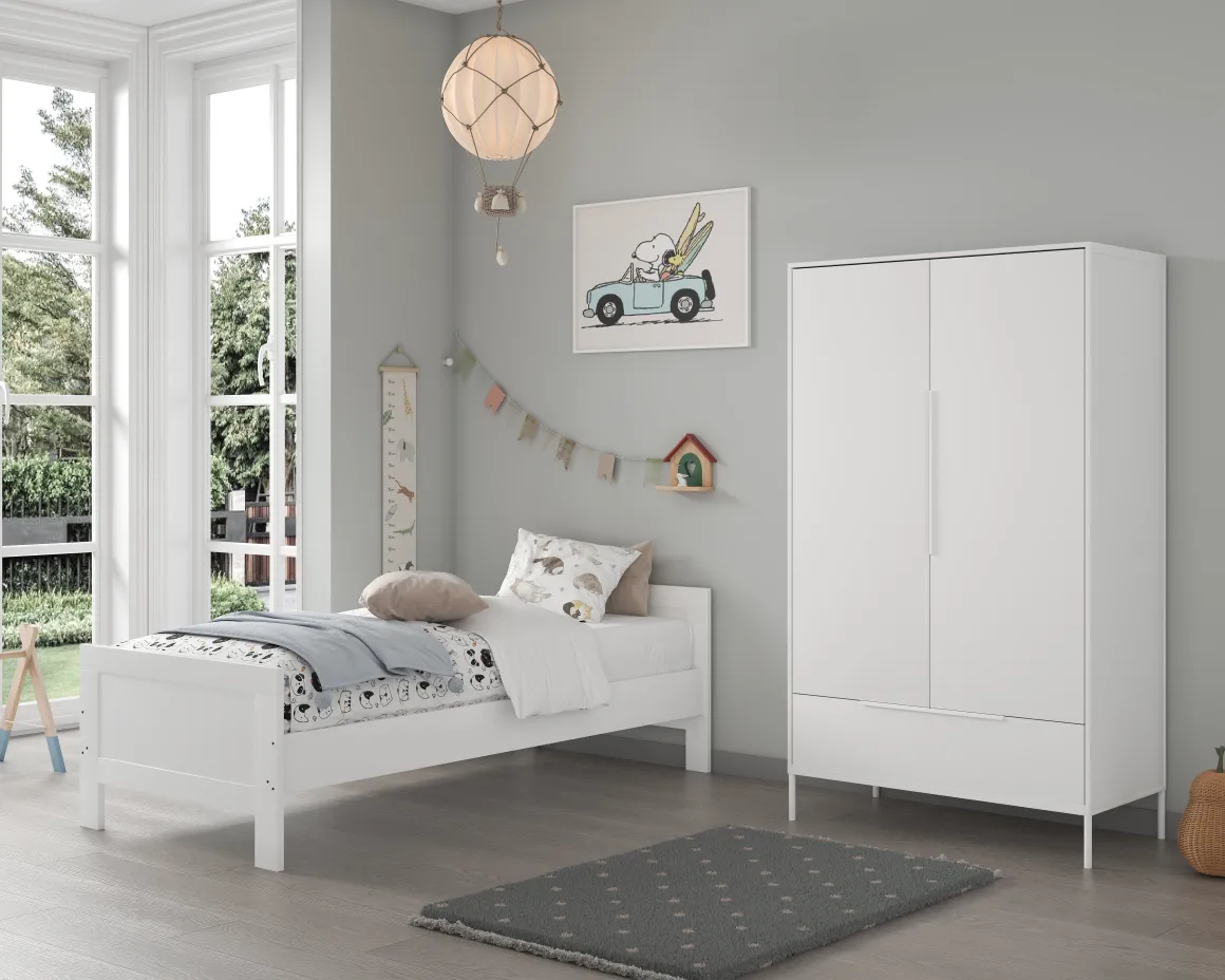 De Born Lucky Tienerkamer Noel Wit 2-delig met Santiago kledingkast is de perfecte combinatie van elegantie, functionaliteit en kwaliteit. Deze set heeft een frisse, witte uitstraling die zorgt voor een rustige en moderne sfeer in de kamer van je tiener. Dankzij het tijdloze design past de kamer in elk interieur en groeit hij moeiteloos mee met de smaak en leeftijd van je kind.