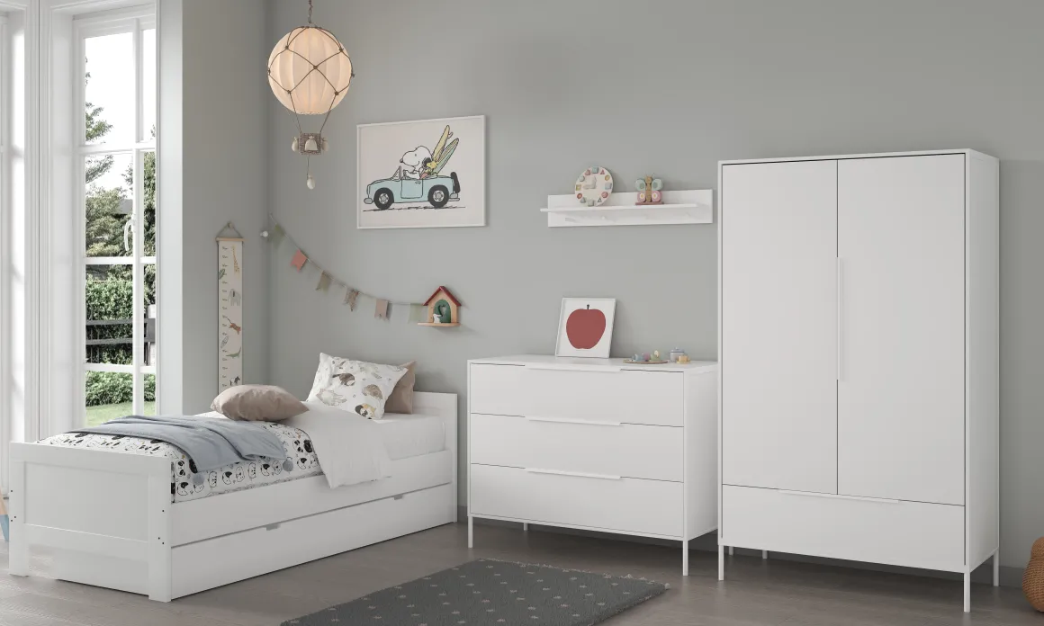 De Born Lucky Tienerkamer Noel Wit 3-delig met bed, kledingkast en commode is de perfecte combinatie van stijl, functionaliteit en duurzaamheid. Deze set is ontworpen voor ouders die een frisse, moderne en praktische kamer willen creëren waarin hun tiener zich helemaal thuis voelt. De strakke lijnen, witte afwerking en hoogwaardige materialen geven de kamer een rustige en eigentijdse uitstraling die jarenlang meegaat.