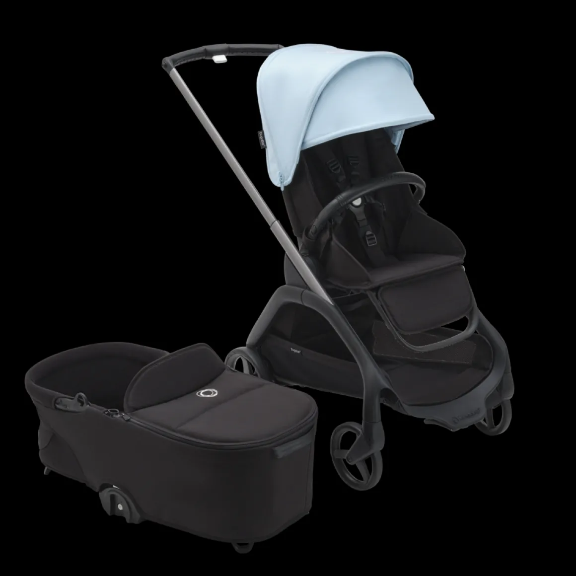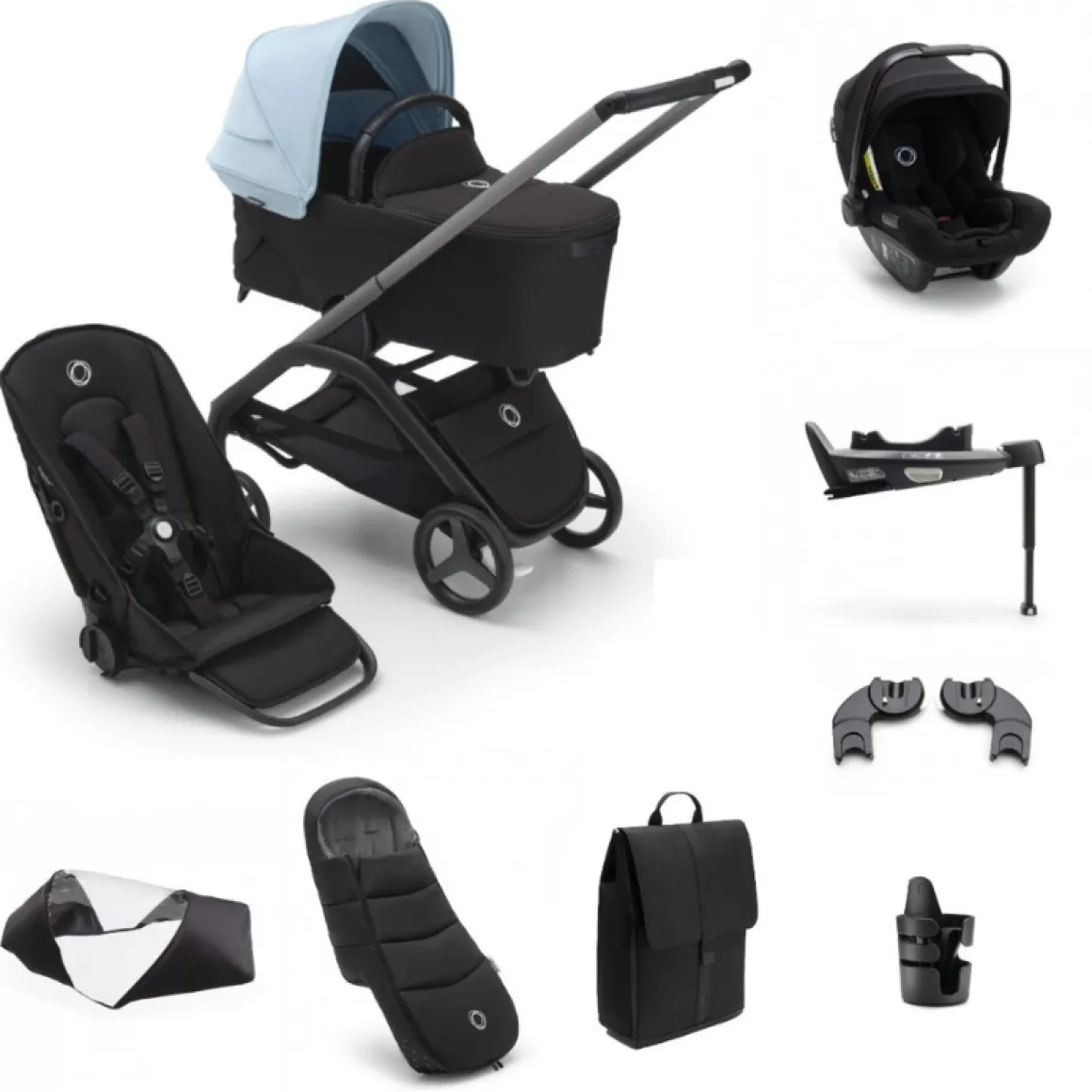 | Inbegrepen accessoires | Onderstel met wielen en handgrepen, reiswieg, zitting, voetensteun, UPF 50+ zonnekap, boodschappenmand, draagband, draaibare bumperbeugel, bevestigingsklem voor parasol+, groep 0 autostoel, autostoel adapters, Isofix base en meer |