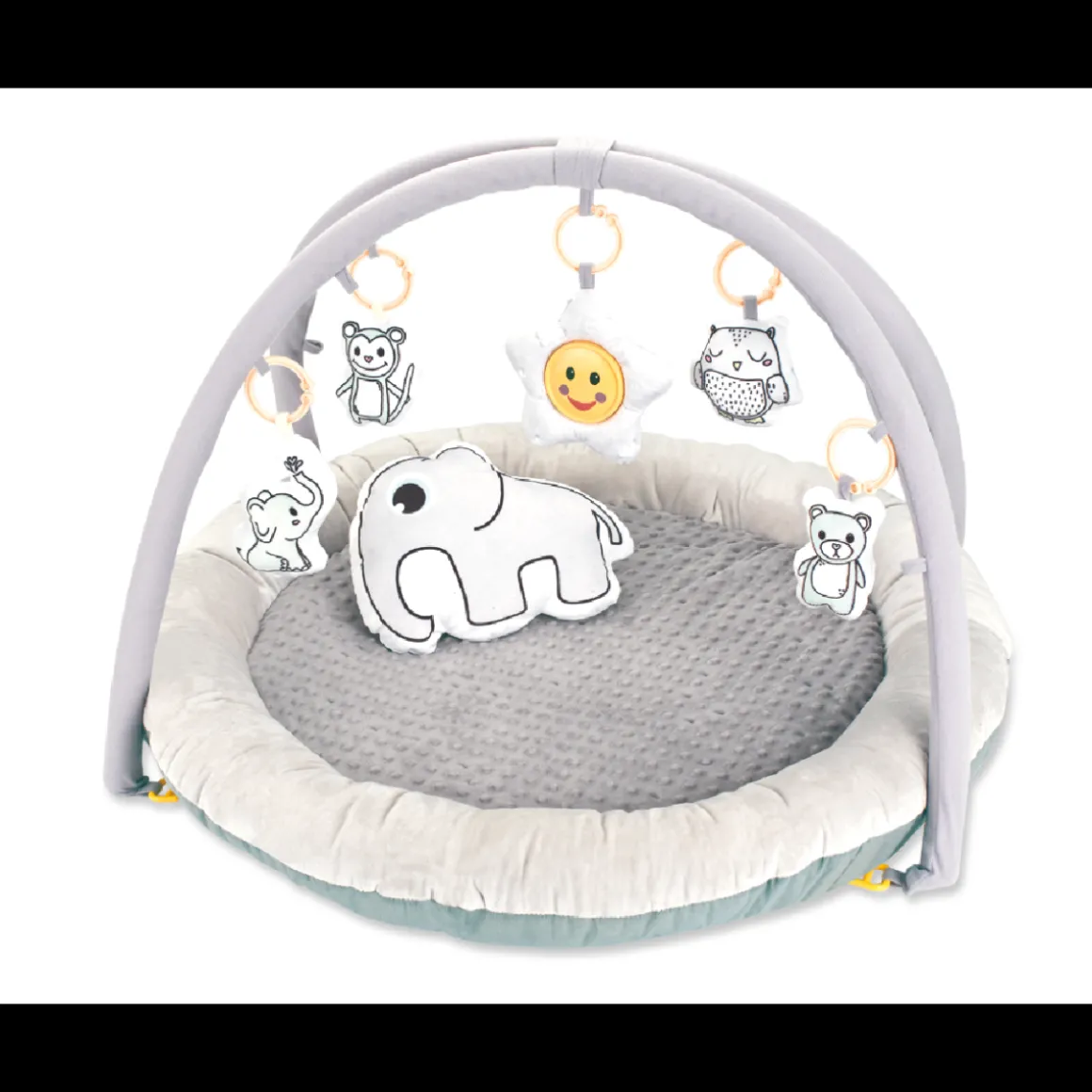 Aan de boog hangen verschillende vrolijke speeltjes, die ook van de boog afgehaald kunnen worden. De 5 speeltjes hebben allemaal een verschillende vorm en uiterlijk. Ook zit er een losse knuffel bij het speelkleed, waar eindeloos mee gespeeld kan worden!