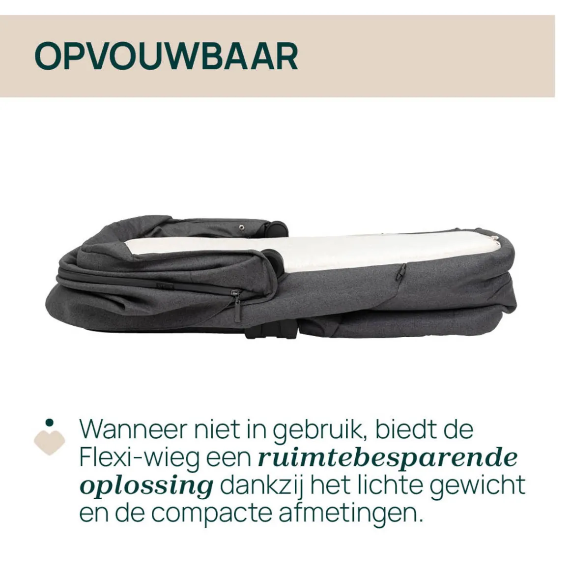 De Flexi reiswieg is uiterst flexibel. De reiswieg is compact inklapbaar en daardoor gemakkelijk mee te nemen of op te bergen. Ideaal voor ouders die graag onderweg zijn of weinig ruimte hebben.