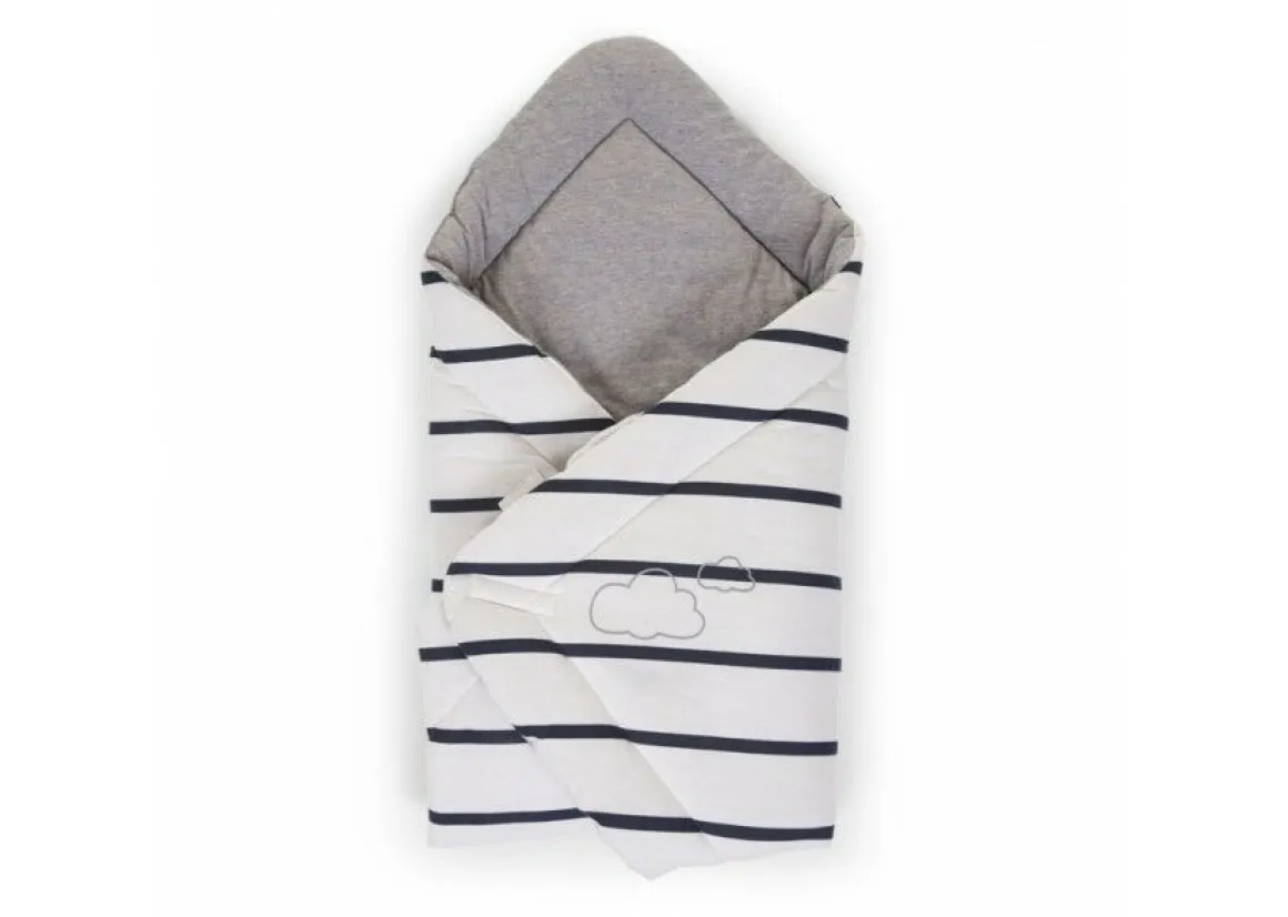 De babywrapper is een zacht en warm wikkeldeken gemaakt uit hoogwaardig jersey katoen met een kap. Het wikkeldeken heeft aan de ene zijde trendy donkerblauwe strepen en is jersey grijs aan de binnenzijde. Als mooi extra detail heeft het dekentje een zilveren print met het Natti & Co-logo.