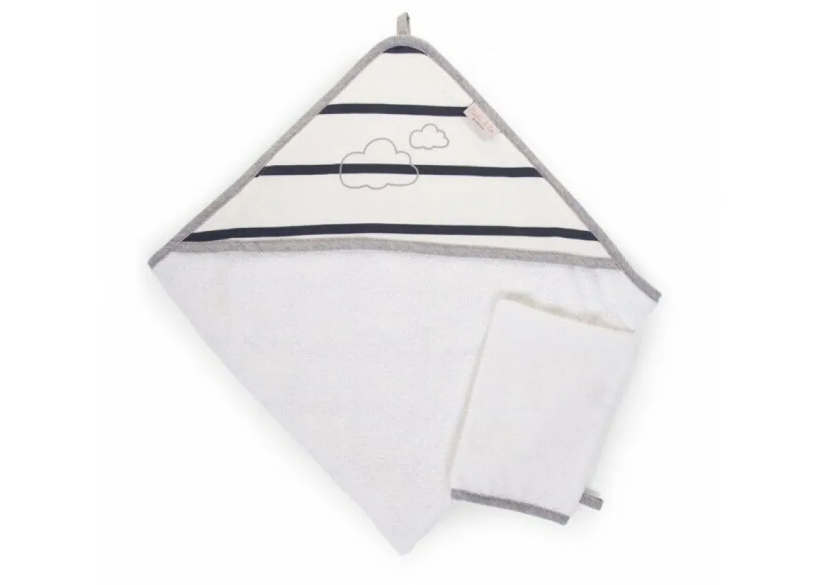 De badcape en het washandje zijn vervaardigd uit een extra dikke, zeer absorberende en ultra zachte badstof. De cape is ideaal om uw baby na zijn badje snel te drogen zodat uw baby geen koud krijgt. De buitenzijde van de cape heeft een mooie, hippe marine-print met donkerblauwe strepen en als mooi extra detail het Natti & Co-logo in het zilver geprint op de kap van badcape. De binnenzijde van de badcape en het washandje is gemaakt uit ultrazacht en absorberend wit terry-katoen.