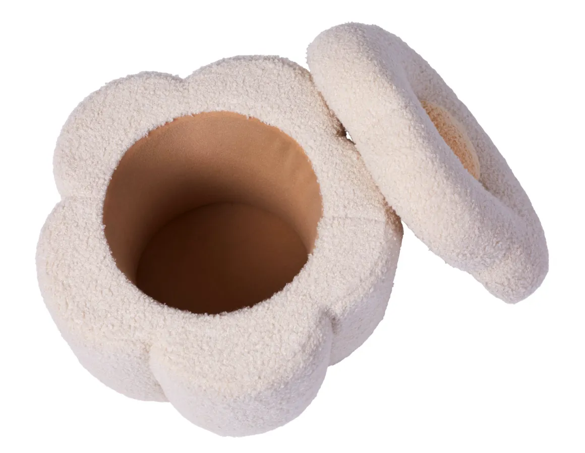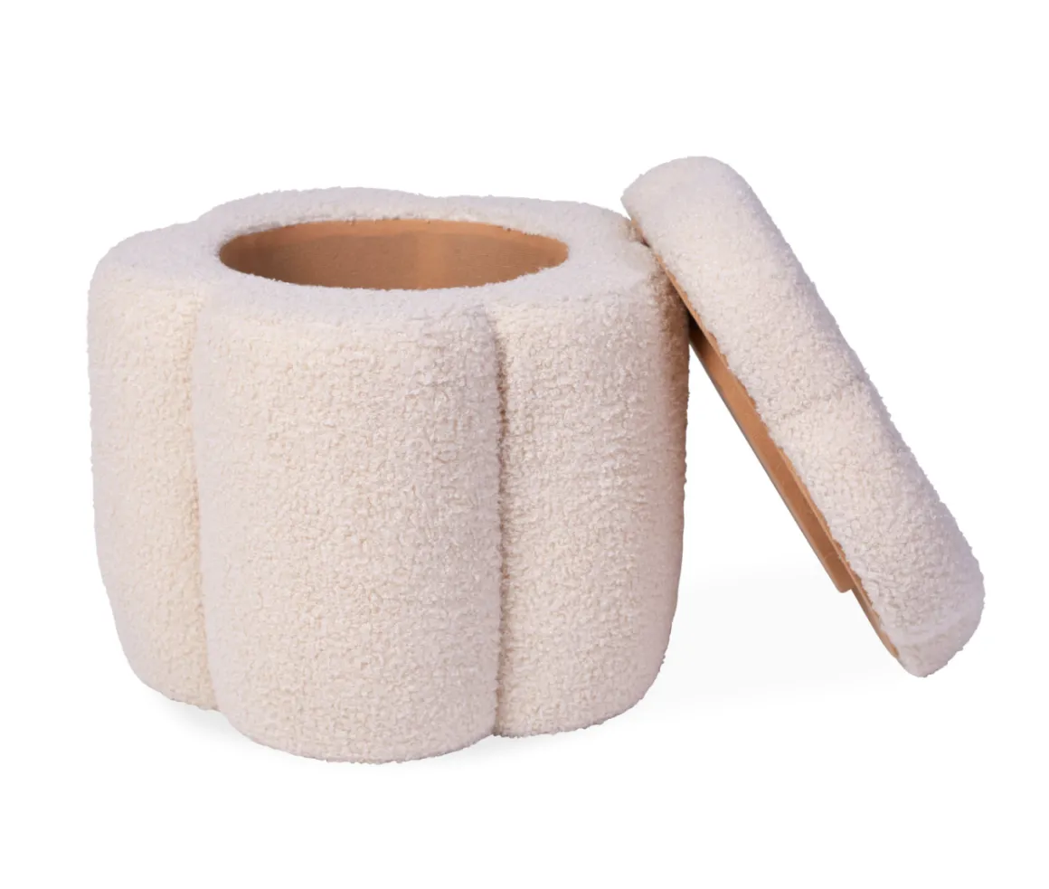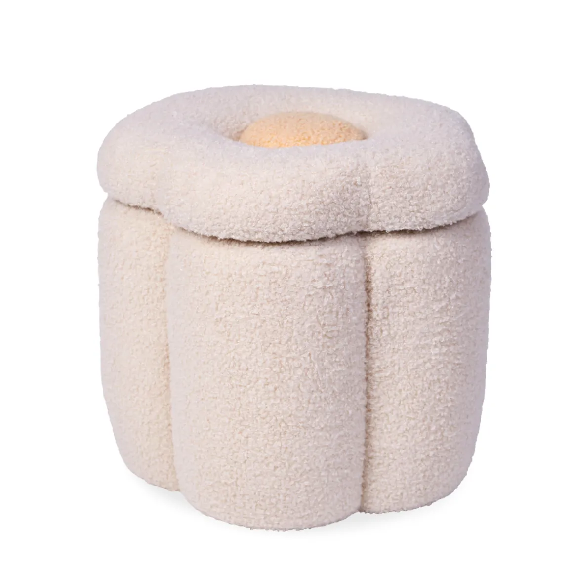 De Childhome Bloem Poef + Toybox is een prachtige toevoeging aan elke kinderkamer. Deze poef in de vorm van een bloem combineert functionaliteit met een stijlvol design. De poef is bekleed met trendy offwhite teddy stof en heeft een lichtgele teddy in het midden, waardoor het een aantrekkelijk en speels meubelstuk is dat perfect past in de kamer van je kleintje.