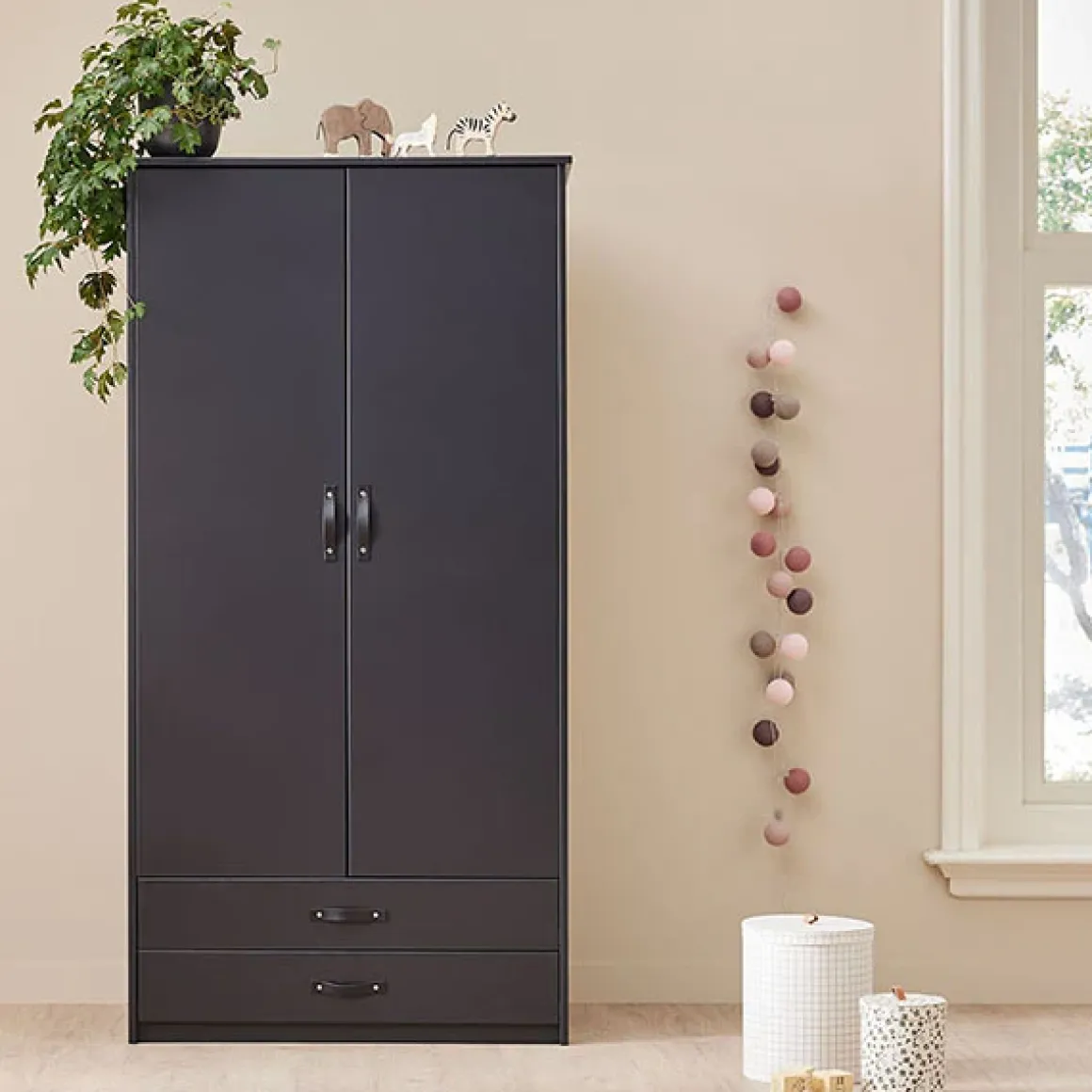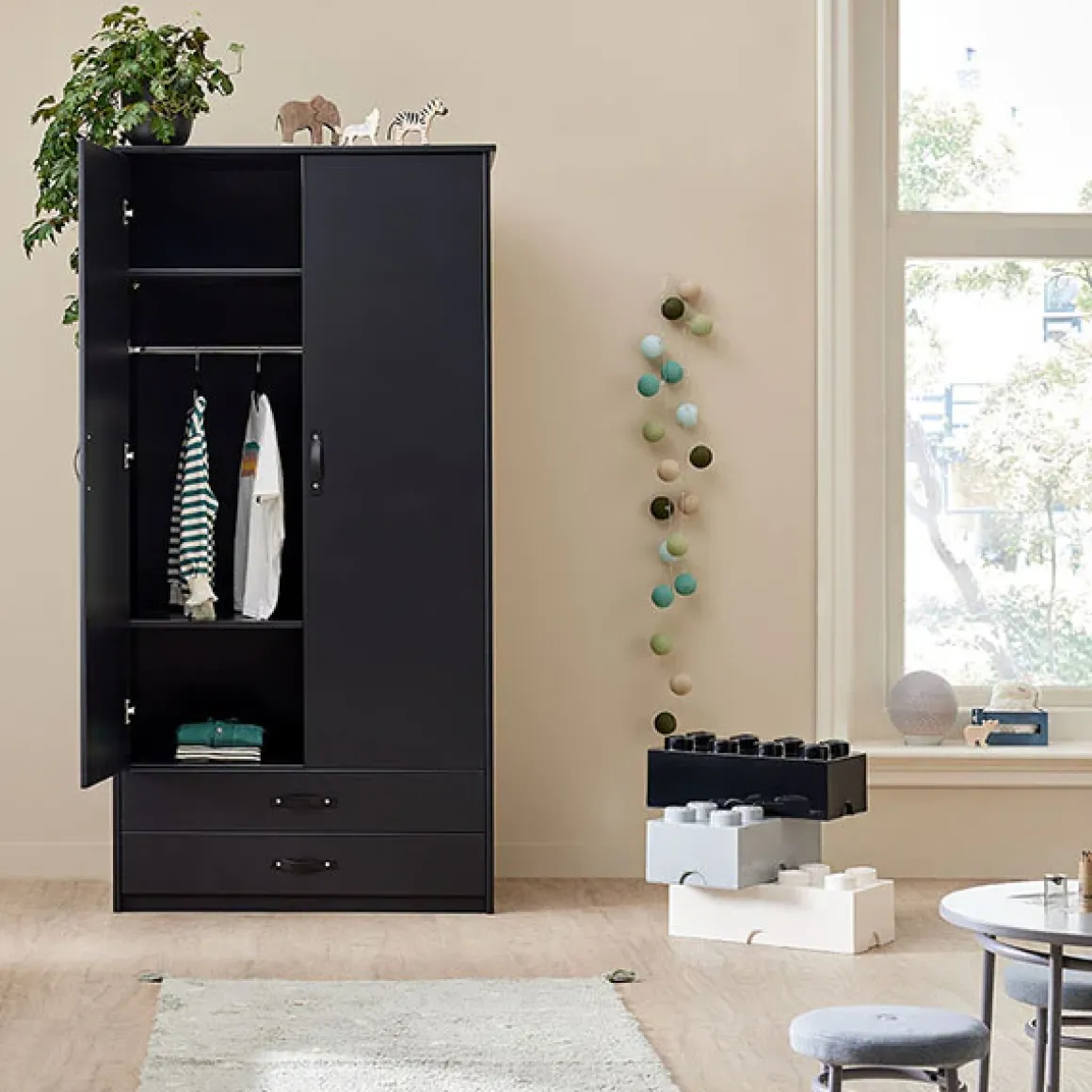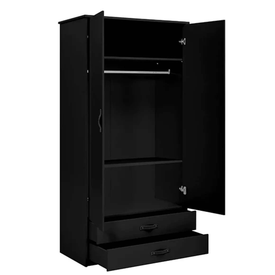 De 2-deurs kledingkast is ontworpen met het oog op functionaliteit. Met diverse planken, een roede en handige lades biedt de kast voldoende ruimte voor al je kleding, accessoires en andere persoonlijke items.