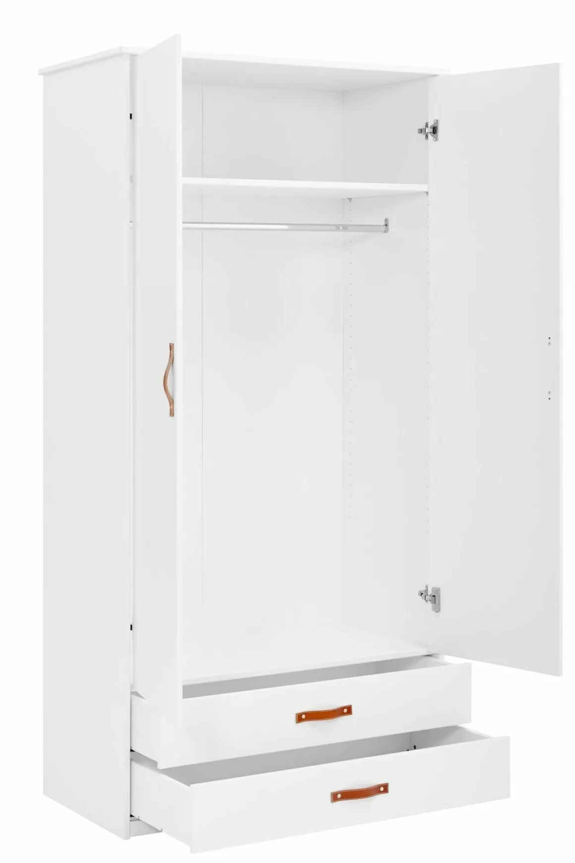 Deze ruime kledingkast beschikt over vele opbergmogelijkheden. Zo zit er achter de twee deuren een breed hanggedeelte met daarboven ruime vakken om kleding of andere spullen neer te leggen. De twee opberglades zij voorzien van stoere leather-look grepen en bieden genoeg opbergruimte voor ondergoed, schoenen of beddengoed.