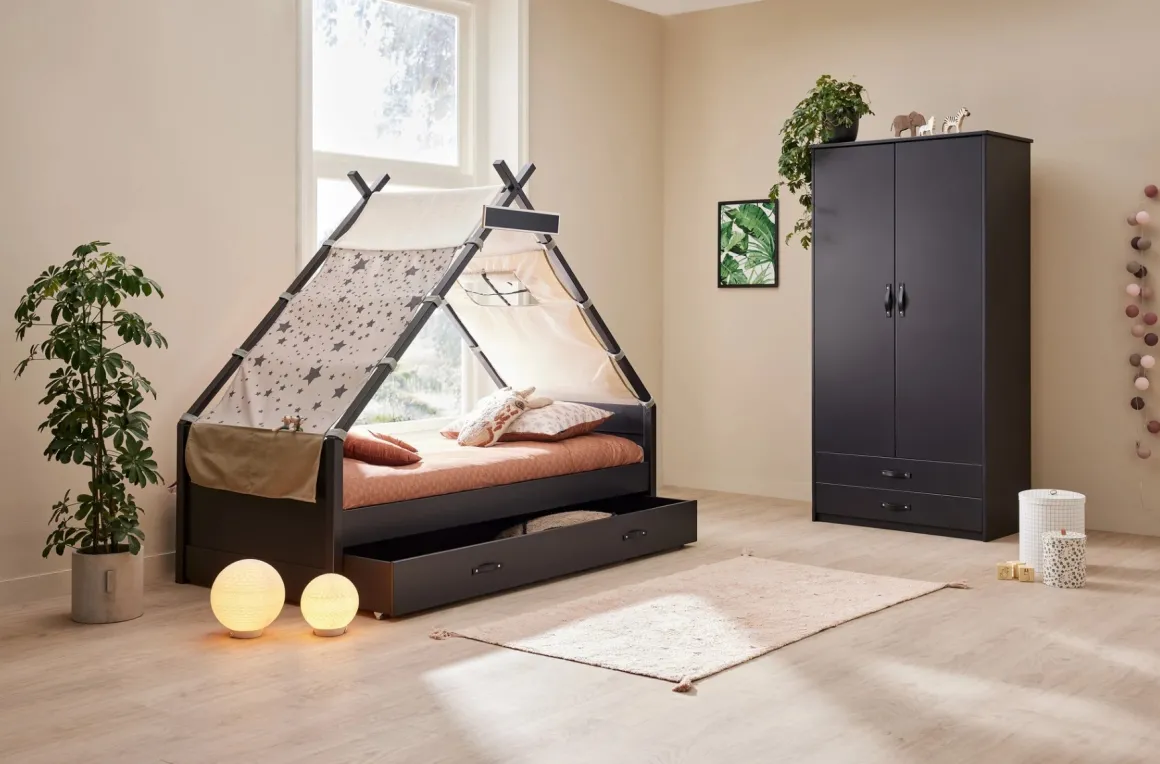 Het Cool Kids tipi bed met Over the Moon doek voegt een speels en magisch element toe aan de kinderkamer. Het tipi-ontwerp geeft een gevoel van geborgenheid, waardoor naar bed gaan een avontuur wordt.