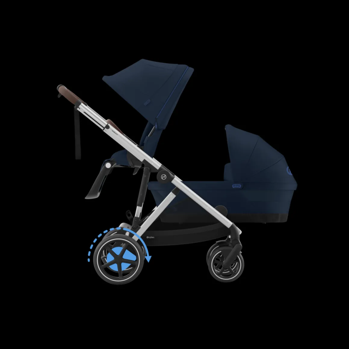 Wil jij onbezorgd met je tweeling op pad kunnen gaan? Dan is de Cybex Tweeling Kinderwagen e-Gazelle S Silver Ocean Blue Navy Blue perfect voor jou! De veelzijdige kinderwagen biedt niet alleen een luxe en eigentijds ontwerp, maar ook een scala aan handige functies die het leven van jou als ouder gemakkelijker maken. De innovatieve e-technologie tilt de dagelijkse wandelingen naar een hoger niveau!