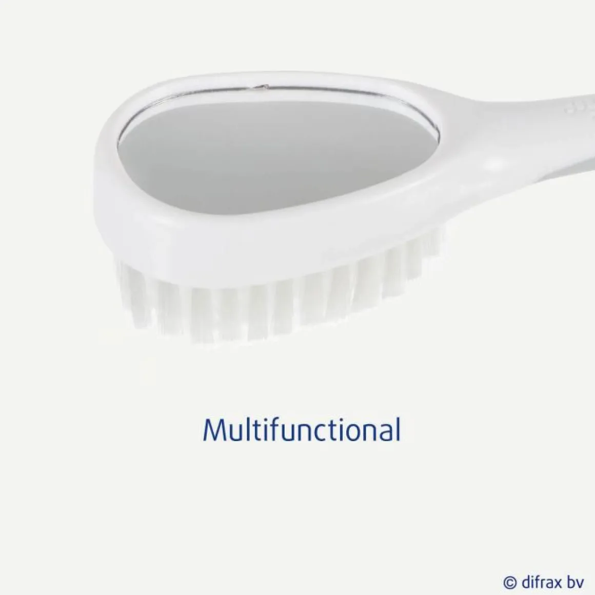 De borstel is voorzien van een spiegeltje aan de achterkant. Het handvat heeft van de kam en de borstel zorgen voor extra grip.