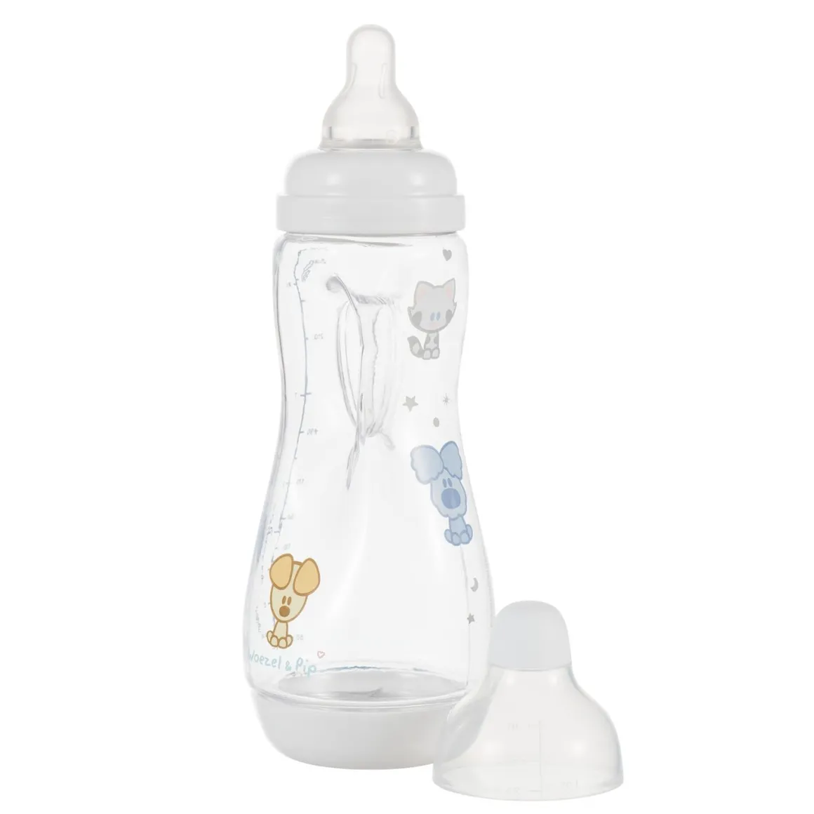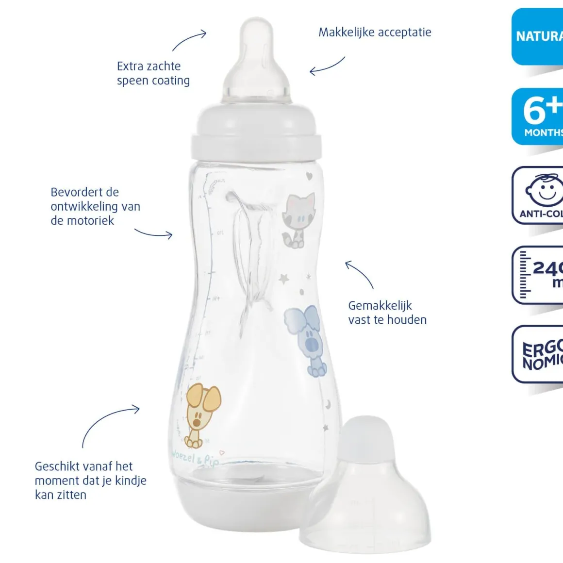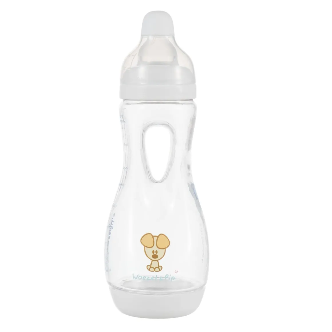De Difrax Handgreepfles Groot Woezel en Pip 240 ml is geschikt vanaf het moment dat jouw kindje kan zitten. Kinderen kunnen door de opening in het midden de fles eenvoudig vasthouden. Het anti-colic ventiel vermindert buikkrampjes.