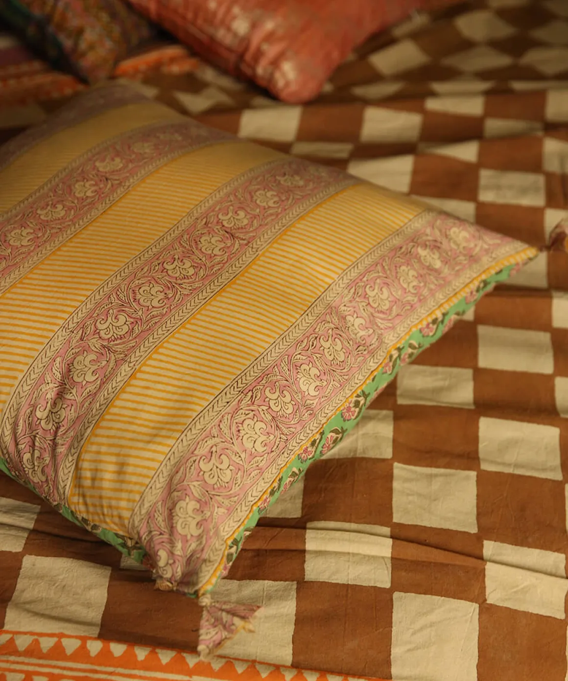 Blokprinten is een eeuwenoude, eenvoudige en ambachtelijke methode om textiel te bedrukken. De unieke patronen en levendige kleuren van het Emma Pillow Dessin worden met de hand aangebracht, wat resulteert in een prachtig ambachtelijk product.