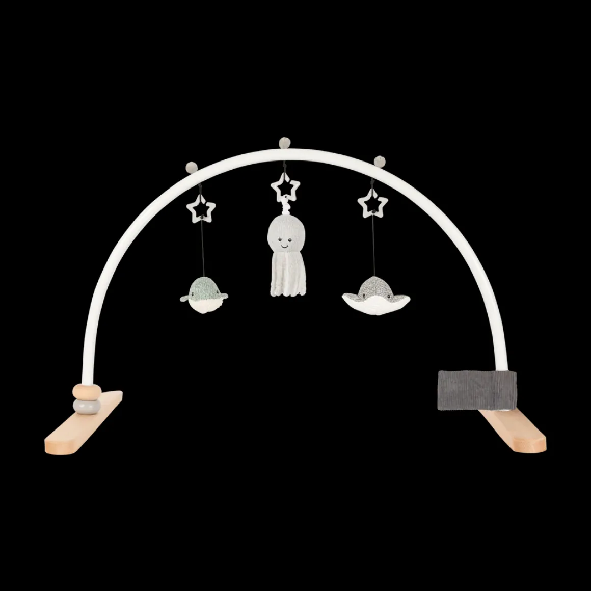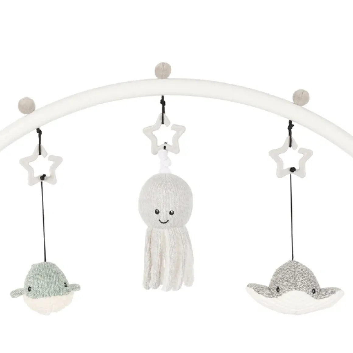 De Babygym Ocean is voorzien van drie schattige knuffeltjes die de nieuwsgierigheid van je baby prikkelen. De rog met belletje, de octopus met trekkoord en de walvis met vrolijk melodietje bieden eindeloos vermaak. Bovendien zijn er aan de zijkanten knisperdoekjes en houten ringetjes toegevoegd voor extra sensorische stimulatie en speelplezier.