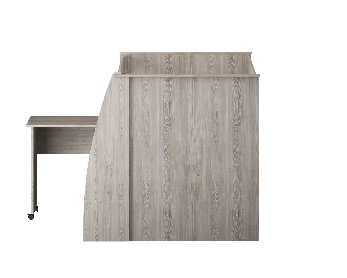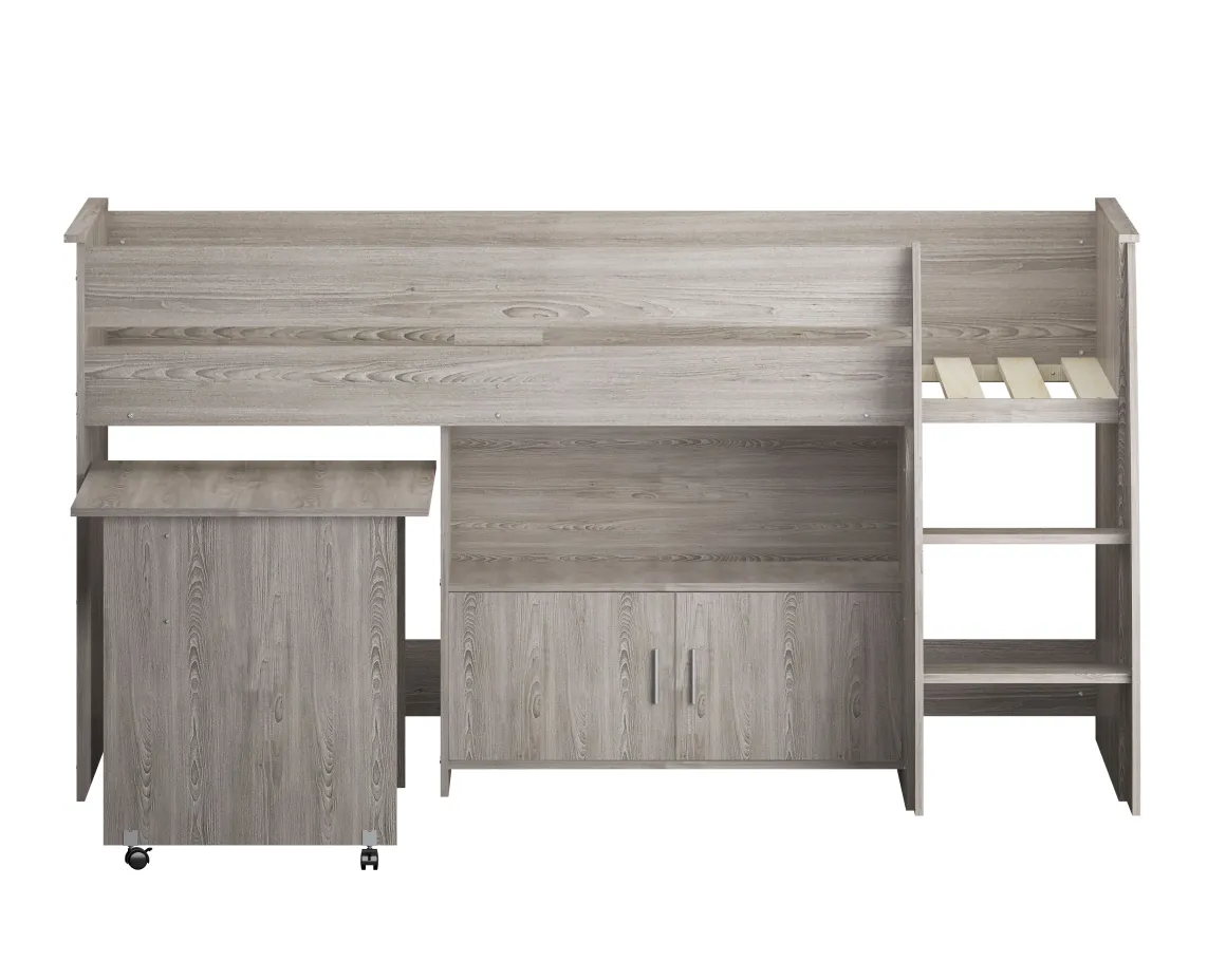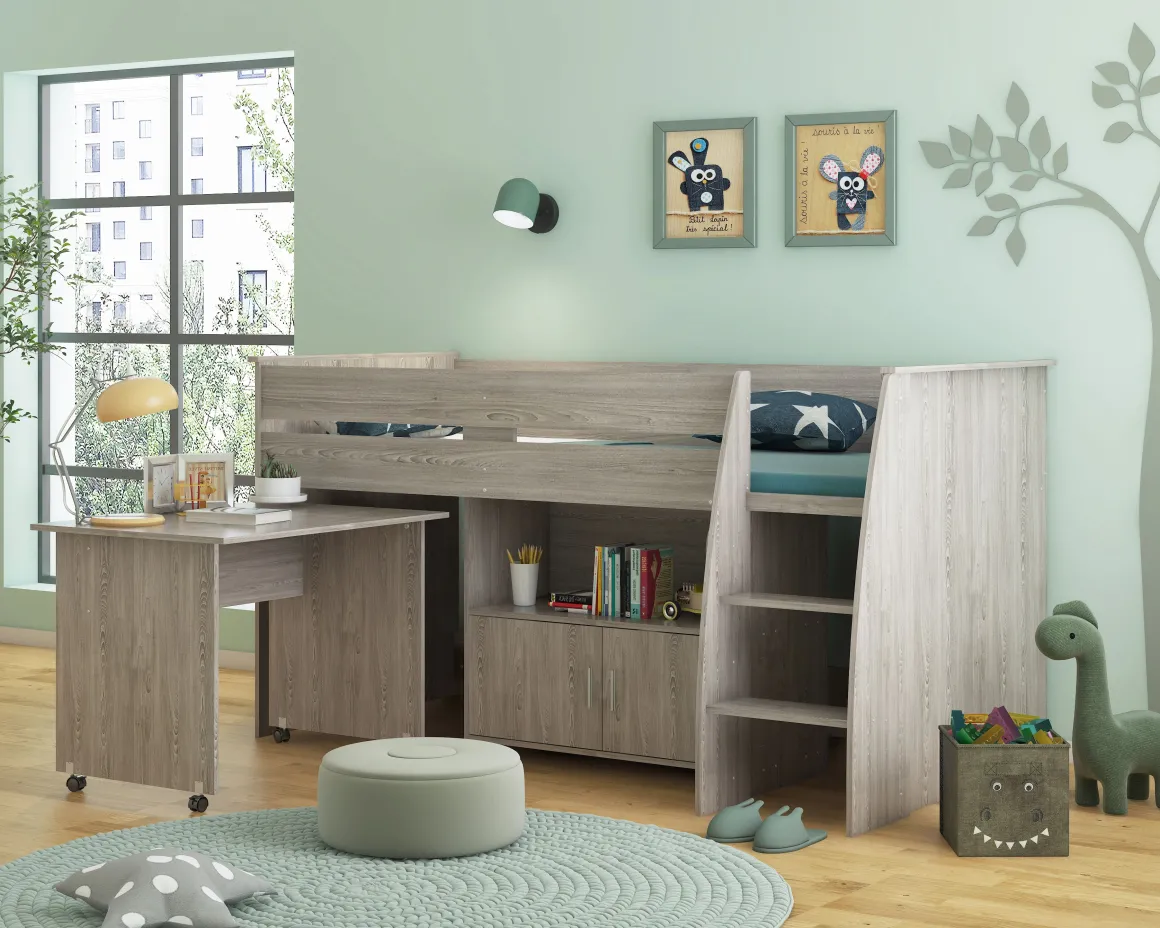 Doordat het bed hoog is, wordt er onder het bed ruimte gecreëerd voor een bureau en opbergruimte. Het bureau is uitschuifbaar. Het opbergkastje houdt het speelgoed, de boeken en andere spulletjes netjes georganiseerd. Met deze alles-in-een oplossing is het gemakkelijker dan ooit om een geordende kinderkamer te creëren!