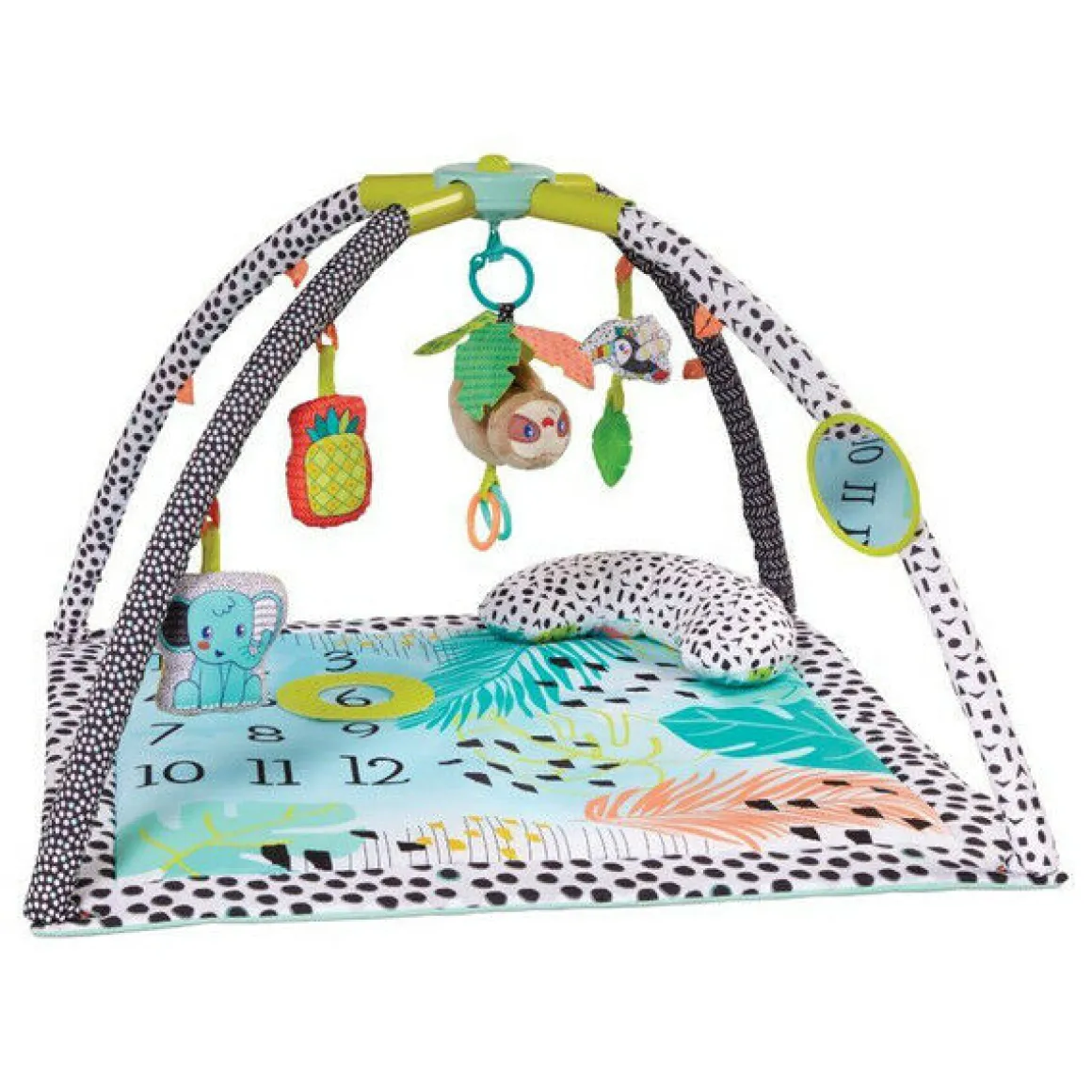 De Infantino speelkleed met speelboog Large 4 In 1 Milestones And Memories Twist And Fold Gym is een vrolijk speelkleed met veel verschillende activiteiten. Zodra je aan het trekkoord van de luiaard trekt speelt deze muziek af en in het spiegeltje kan jouw kleintje zichzelf zien. Je kunt het speelkleed met speelboog gebruiken en zonder speelboog.