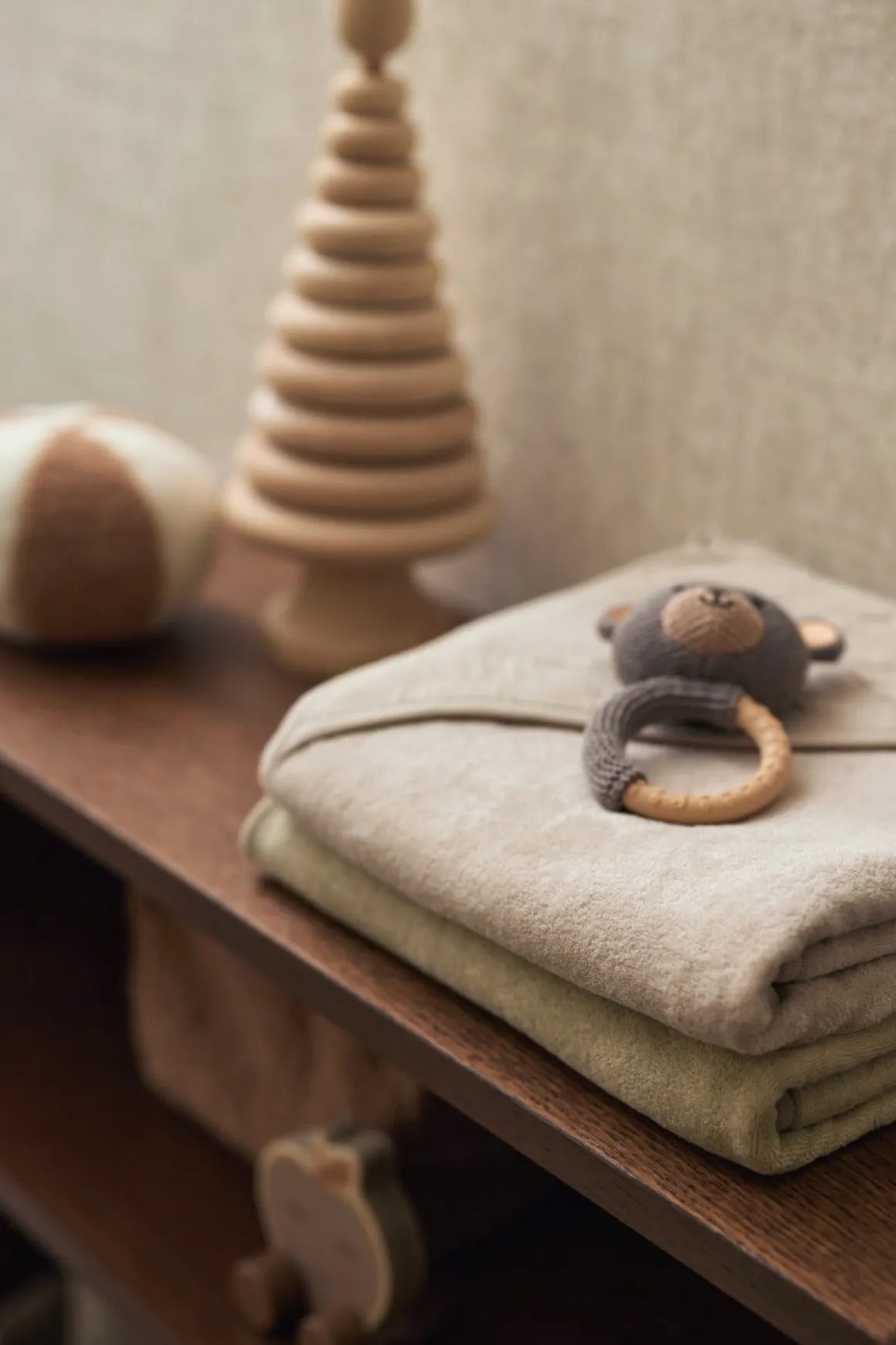 Gemaakt van 100% katoen, weegt de bijtring slechts 38 gram en heeft afmetingen van 6 cm in hoogte, 11 cm in breedte en 14 cm in lengte. Dit maakt de bijtring gemakkelijk vast te houden voor kleine handjes en ideaal voor zowel thuis als onderweg.