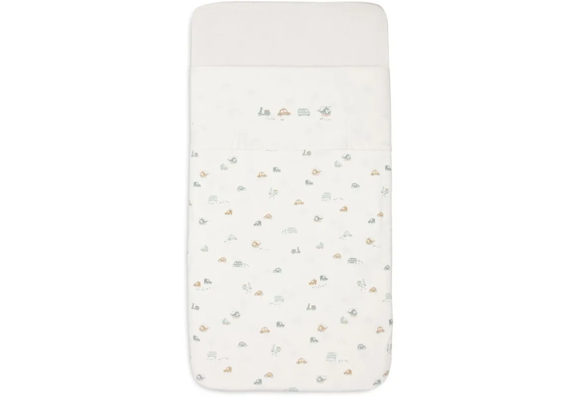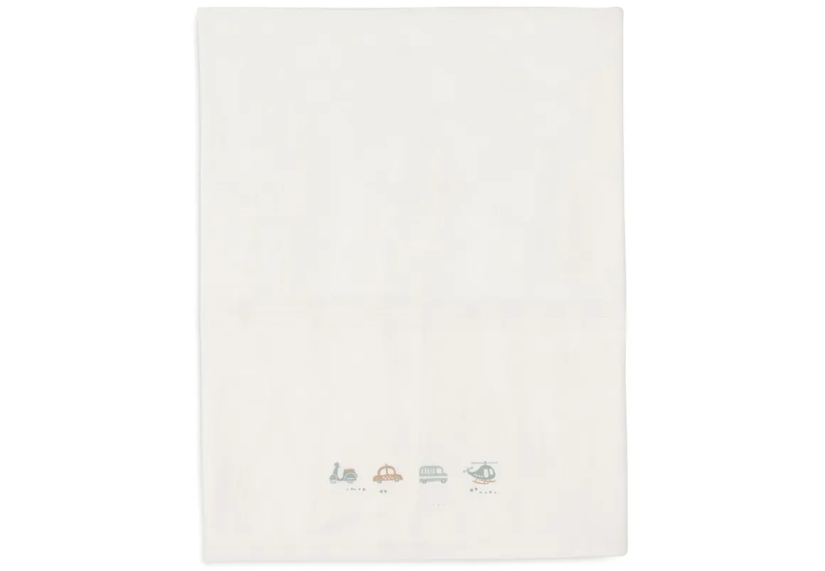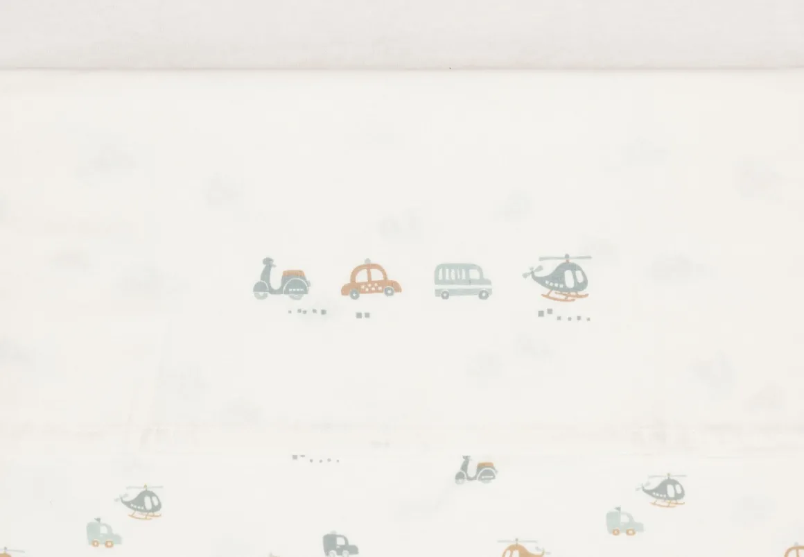 Het Jollein laken voor het ledikant uit de On The Go collectie is een prachtige toevoeging aan de babykamer. Met zijn subtiele ivoorkleur en speelse print van voertuigen zoals autootjes, een scooter en een helikopter, brengt dit lakentje een vrolijke sfeer. De illustraties zijn gedrukt op de omgevouwen rand, wat zorgt voor een stijlvol en speels accent in het bedje van je kleintje.
