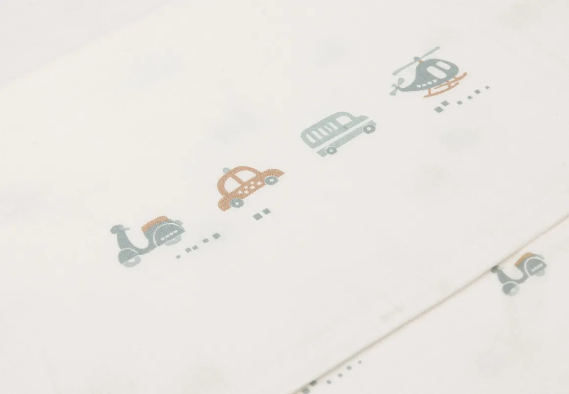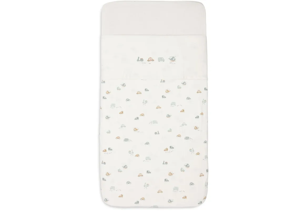 Het Jollein laken voor de wieg uit de On The Go collectie is een prachtige toevoeging aan de babykamer. Met zijn subtiele ivoorkleur en speelse print van voertuigen zoals autootjes, een scooter en een helikopter, brengt dit lakentje een vrolijke sfeer. De illustraties zijn gedrukt op de omgevouwen rand, wat zorgt voor een stijlvol en speels accent in het bedje van je kleintje.