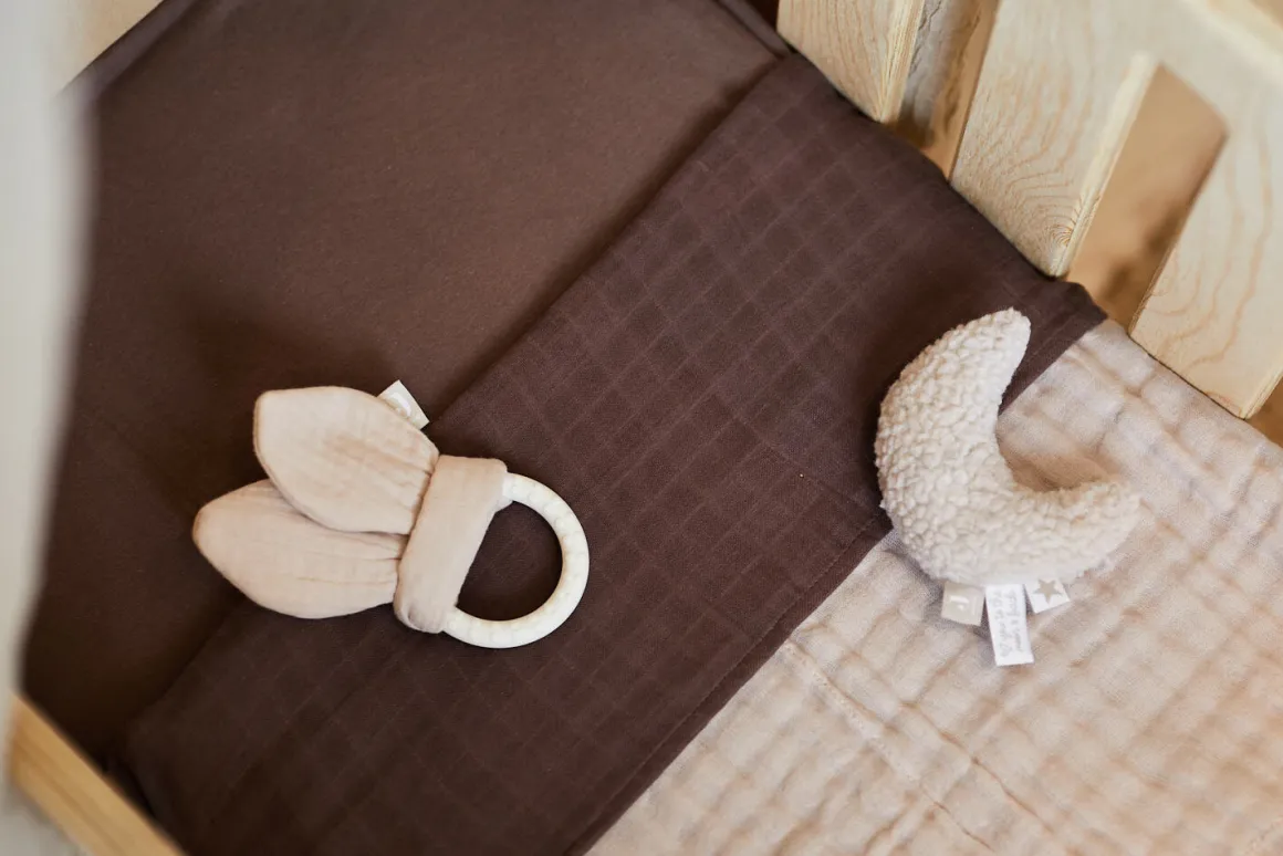 - Rammelaar in de vorm van een maantje, gemaakt van teddy stof