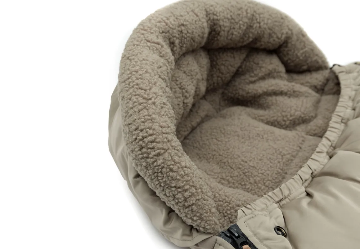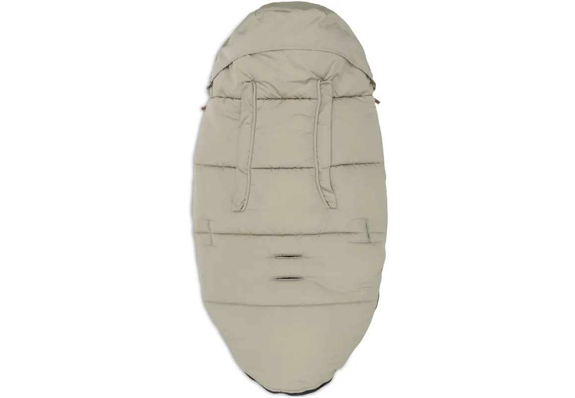Aan de achterkant van de voetenzak bevindt zich een handige kap die om de hoofdsteun van de buggy of kinderwagen kan worden gevouwen. Zo blijft de voetenzak stevig op zijn plaats, zelfs tijdens bewegelijke ritje.