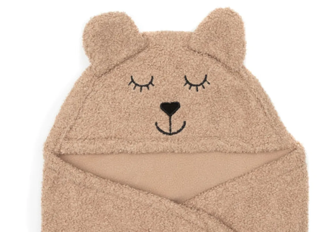 Schattige oortjes en een lief berengezichtje op de capuchon van de wikkeldeken