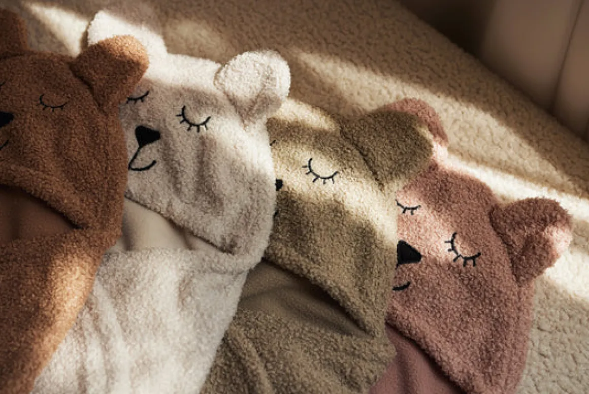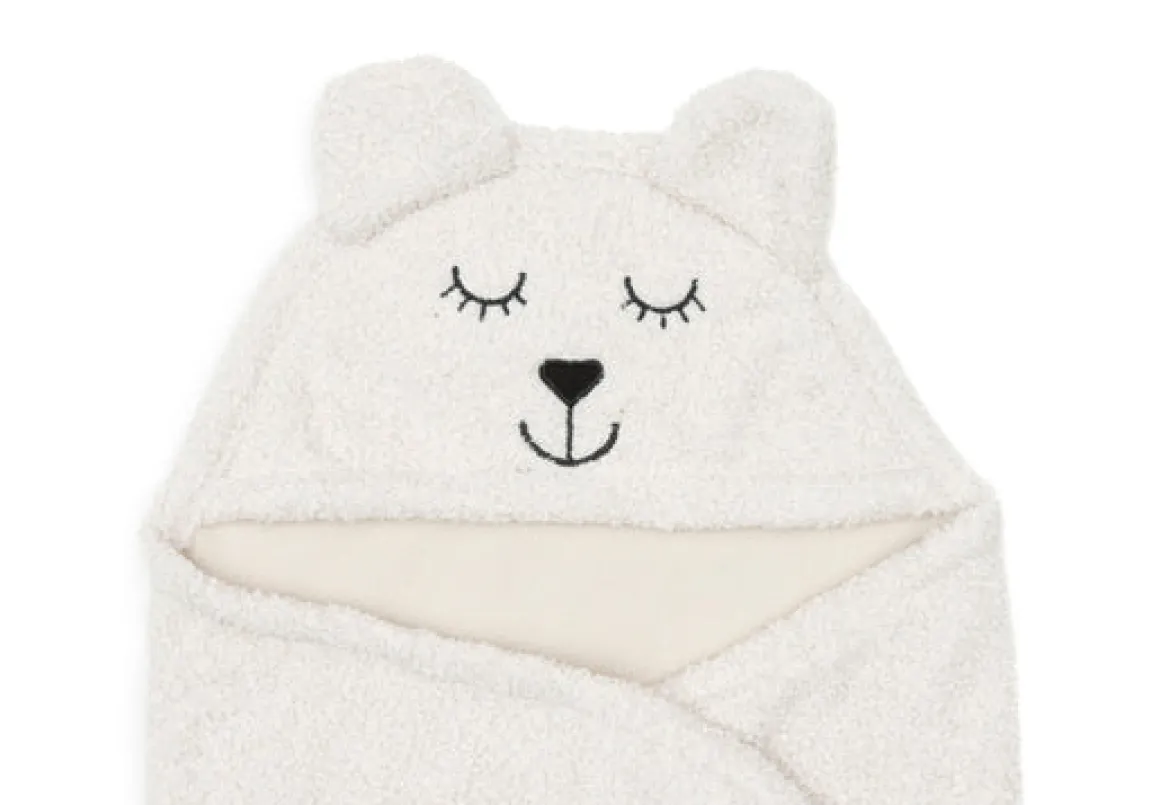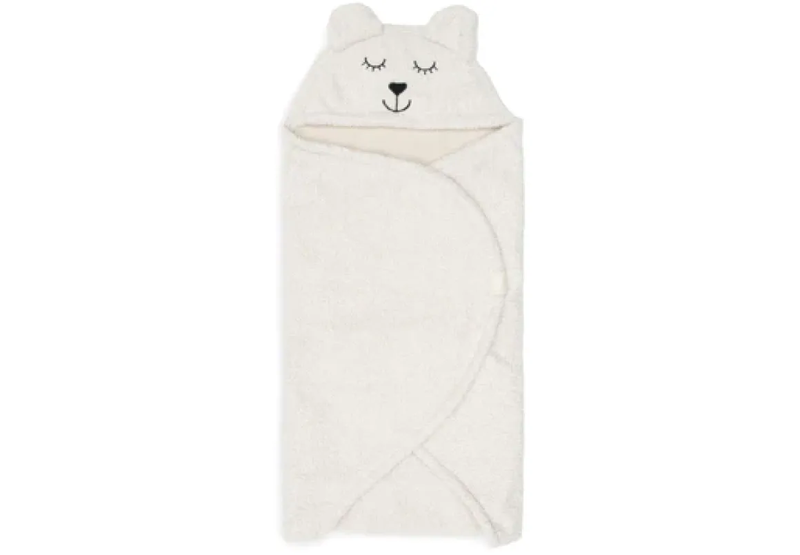 Schattige oortjes en een lief berengezichtje op de capuchon van de wikkeldeken