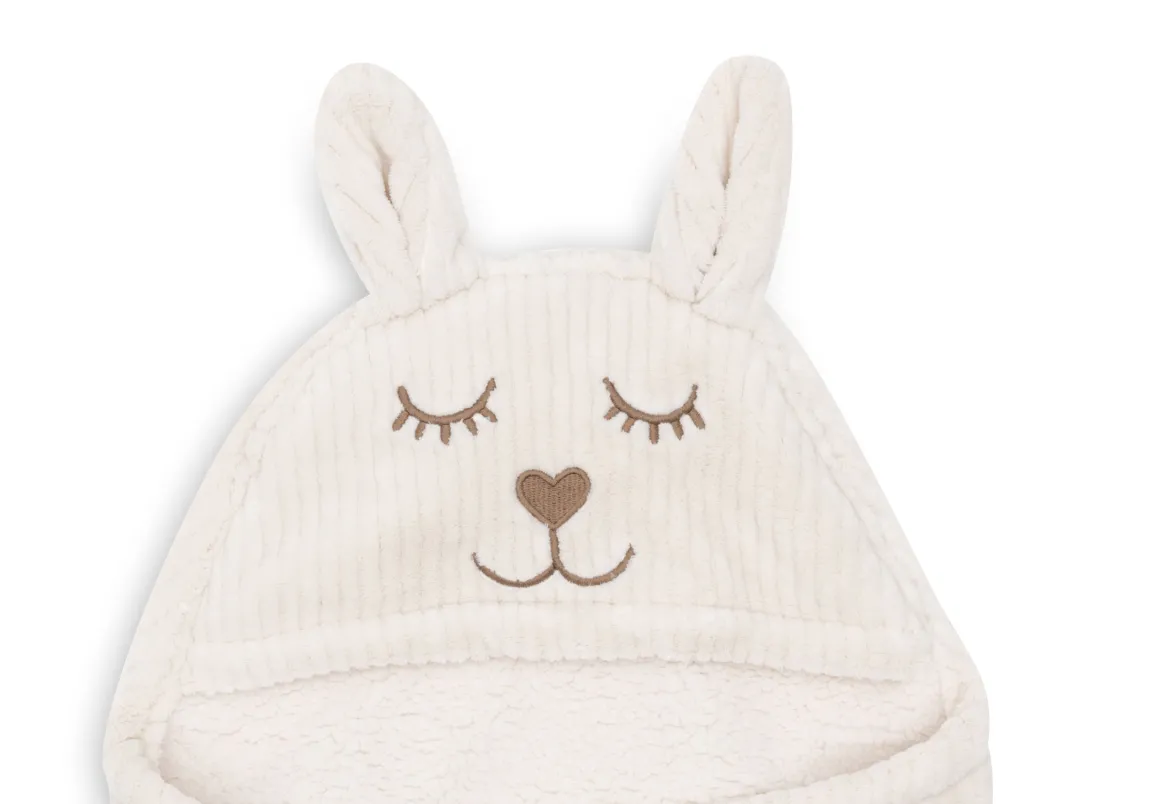 Wikkel je kindje in de wikkeldeken en sluit de deken met de praktische klittenbandstroken. Doe de capuchon op het hoofdje van je kindje en laat je betoveren door de schattige oortjes en het lieve gezichtje op het mutsje.