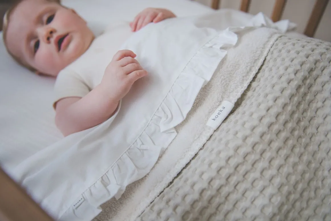 Met de Koeka Laken Ruffle maak je het plaatje van je kinderbed compleet. Dit laken is speciaal ontworpen om perfect te passen in elke bedje en biedt een stijlvolle en comfortabele oplossing voor je kleintje. Het trendy ruffle detail voegt een speelse en elegante touch toe, waardoor het laken moeiteloos te combineren is met de dekens. Het laken is gemaakt van hoogwaardig, crispy katoen, wat zorgt voor een comfortabele nachtrust voor je baby en ervoor zorgt dat de deken langer fris blijft.