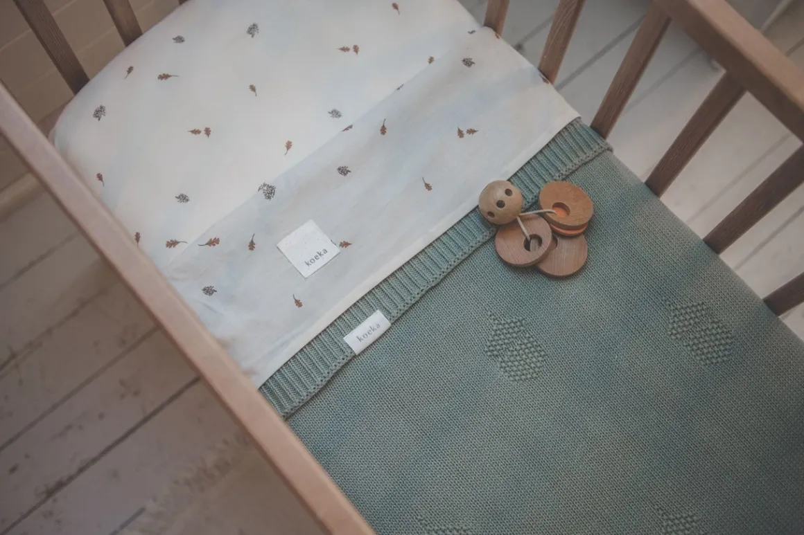 De stijlvolle Koeka Wiegdeken Nuts Shadow Green 75 x 90 cm heeft een schattig ingebreid patroon met herfstige eikeltjes. De deken is perfect voor het opmaken van het wiegje. Combineer de deken met een bijpassend lakentje voor een complete set beddengoed.