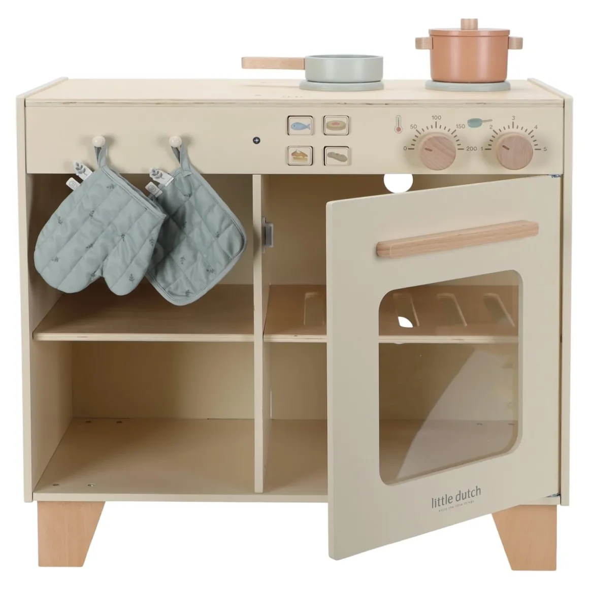 Deze speelkeuken is voorzien van een fornuis met draaiknoppen, een oven en opbergruimte. Inclusief houten kookgerei en accessoires, zodat er direct gekookt kan worden. De realistische details maken het spelen nog leuker en stimuleren rollenspel.