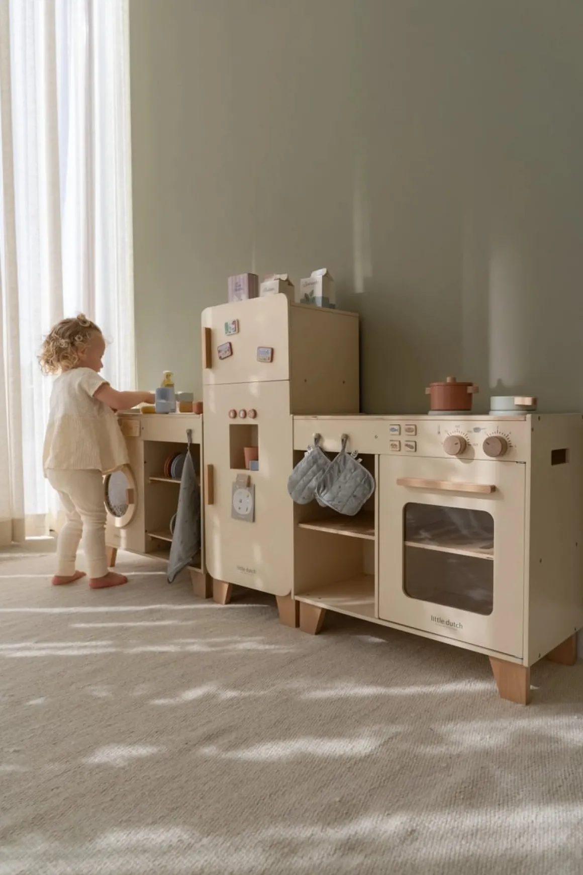 De keuken is gemaakt van stevig hout en afgewerkt met kindvriendelijke verf, waardoor het niet alleen veilig is, maar ook lang meegaat. Dankzij de zachte kleuren en het tijdloze ontwerp past hij perfect in elk interieur.