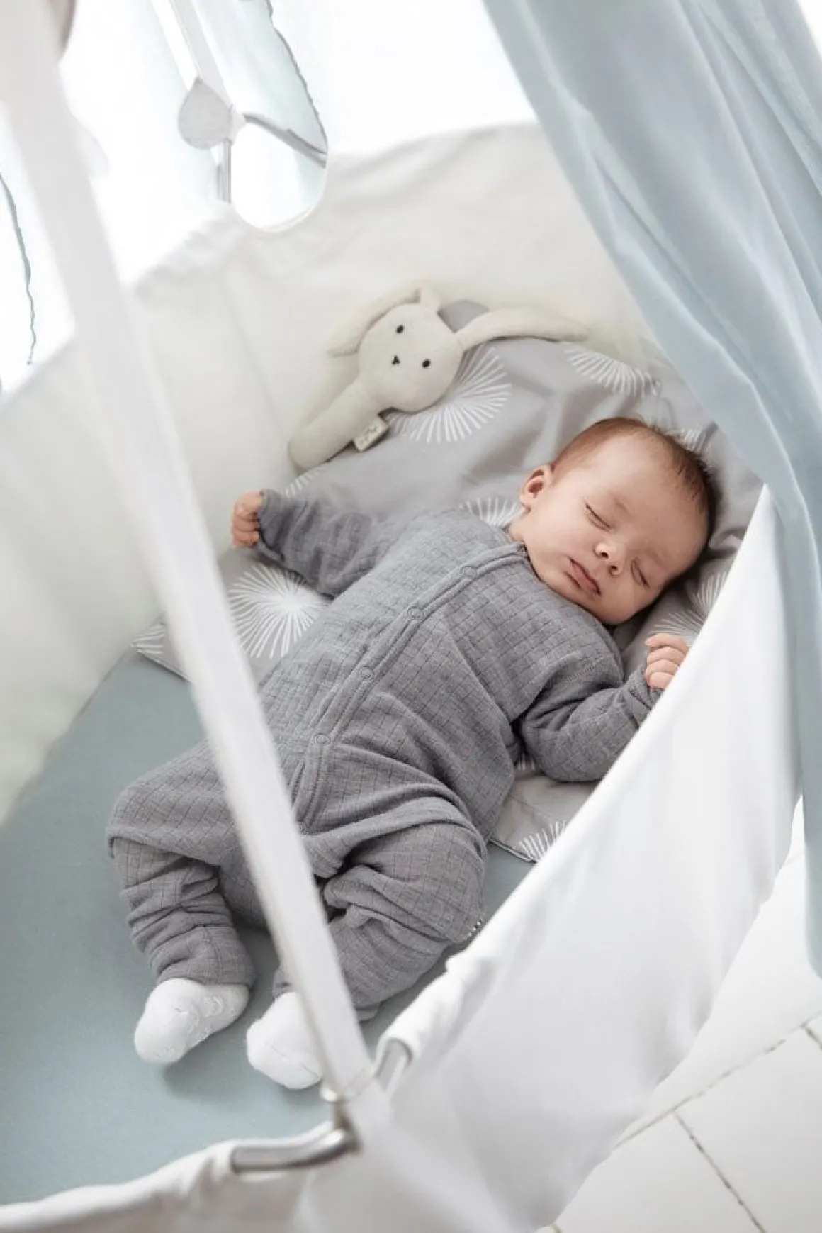 Het frame van de wieg is gemaakt van hoogwaardig staal, terwijl de wieg zelf is vervaardigd van 100% biologisch katoen. Dit zorgt niet alleen voor een duurzame en milieuvriendelijke keuze, maar ook voor een zachte en comfortabele slaapomgeving voor jouw baby.