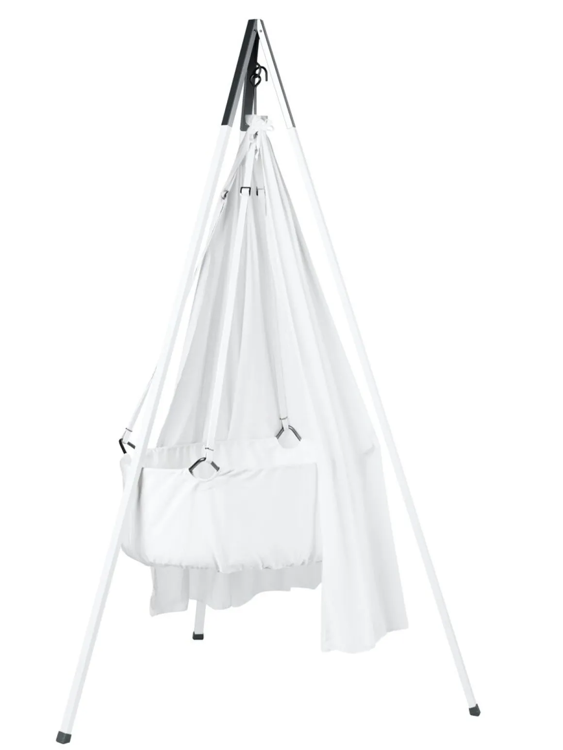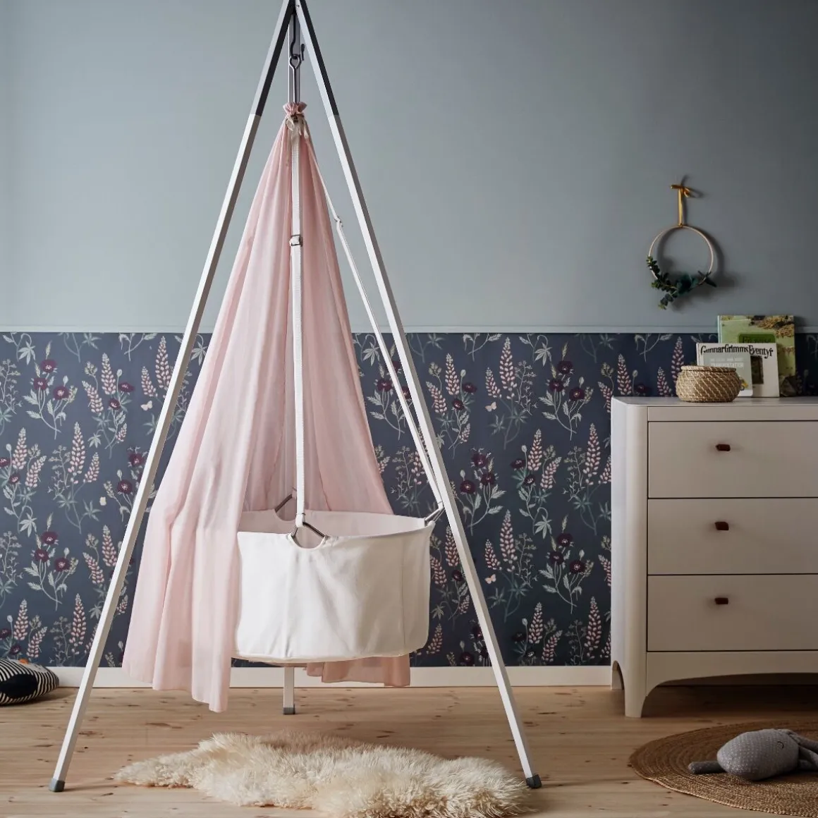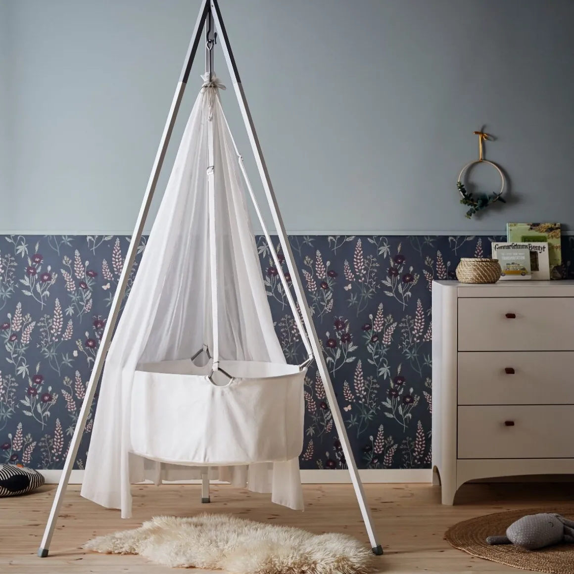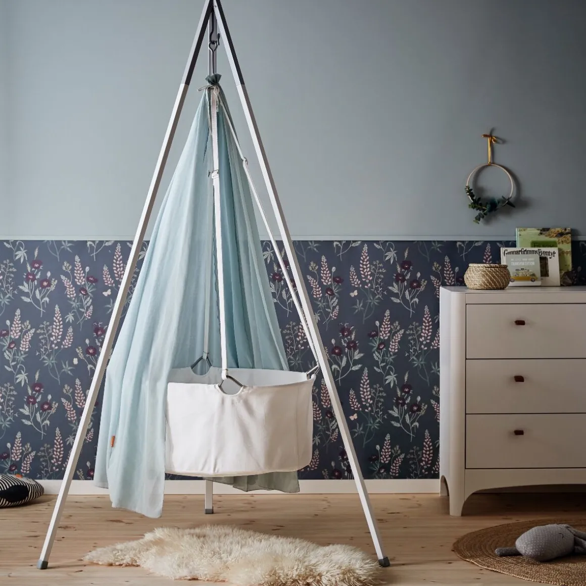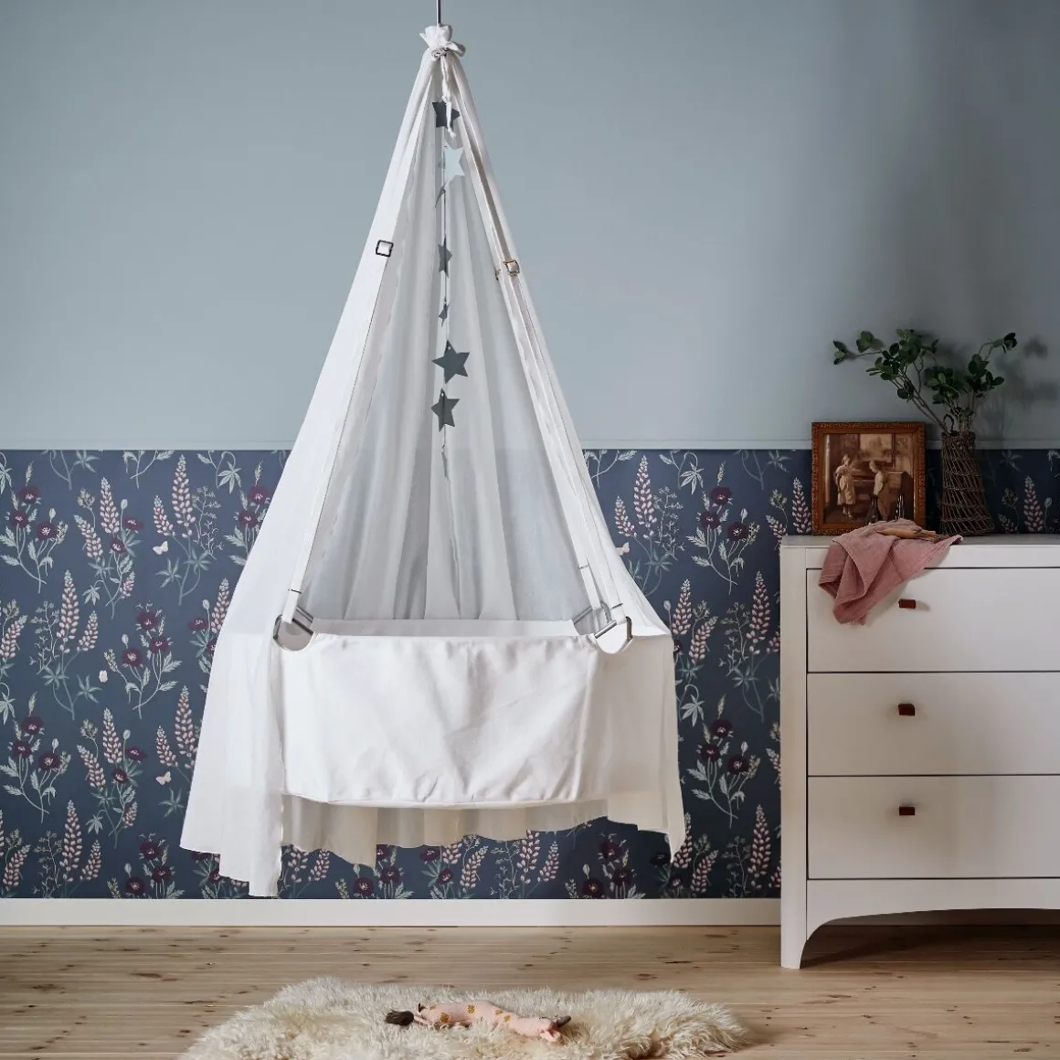 Het prachtige wiegje van Leander is op te hangen aan een plafondhaak of Leander standaard. Ideaal voor kleine ruimtes.