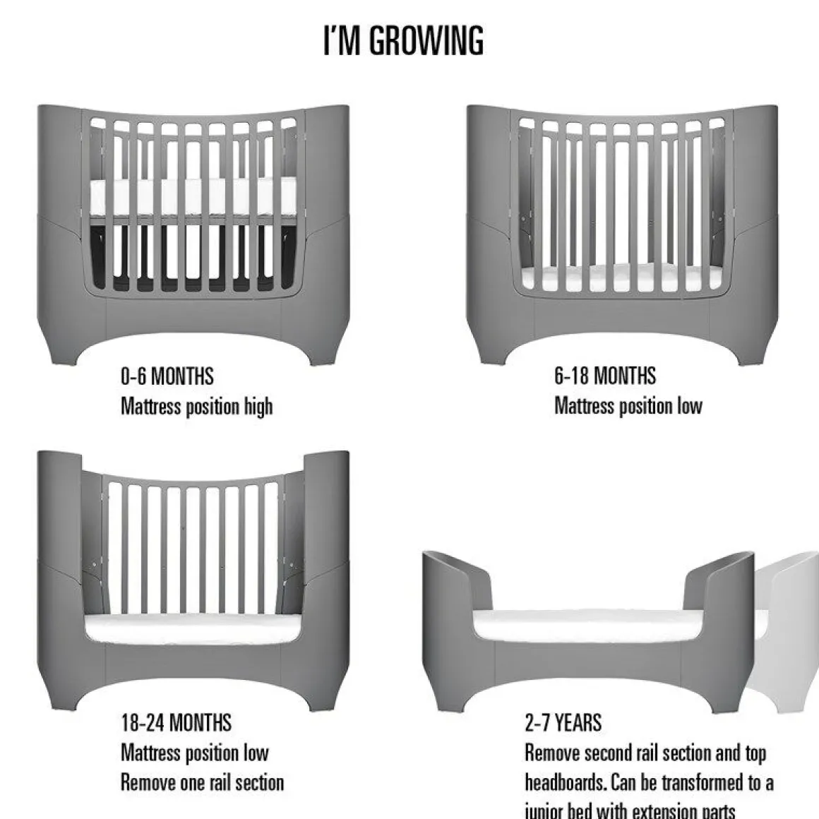 Wanneer je baby is geboren gebruik je dit bed als ledikant. Wanneer je kindje ongeveer 3 jaar is, zal het waarschijnlijk er aan toe zijn aan een groter bed. Met de inbegrepen ‘Junior Kit’ bouw jij het Leander Baby-Junior Bed dan eenvoudig om tot een peuterbed. Zo kan je kindje nog heerlijk vertrouwd in zijn/haar eigen bed slapen totdat het de leeftijd van 7 jaar heeft bereikt.