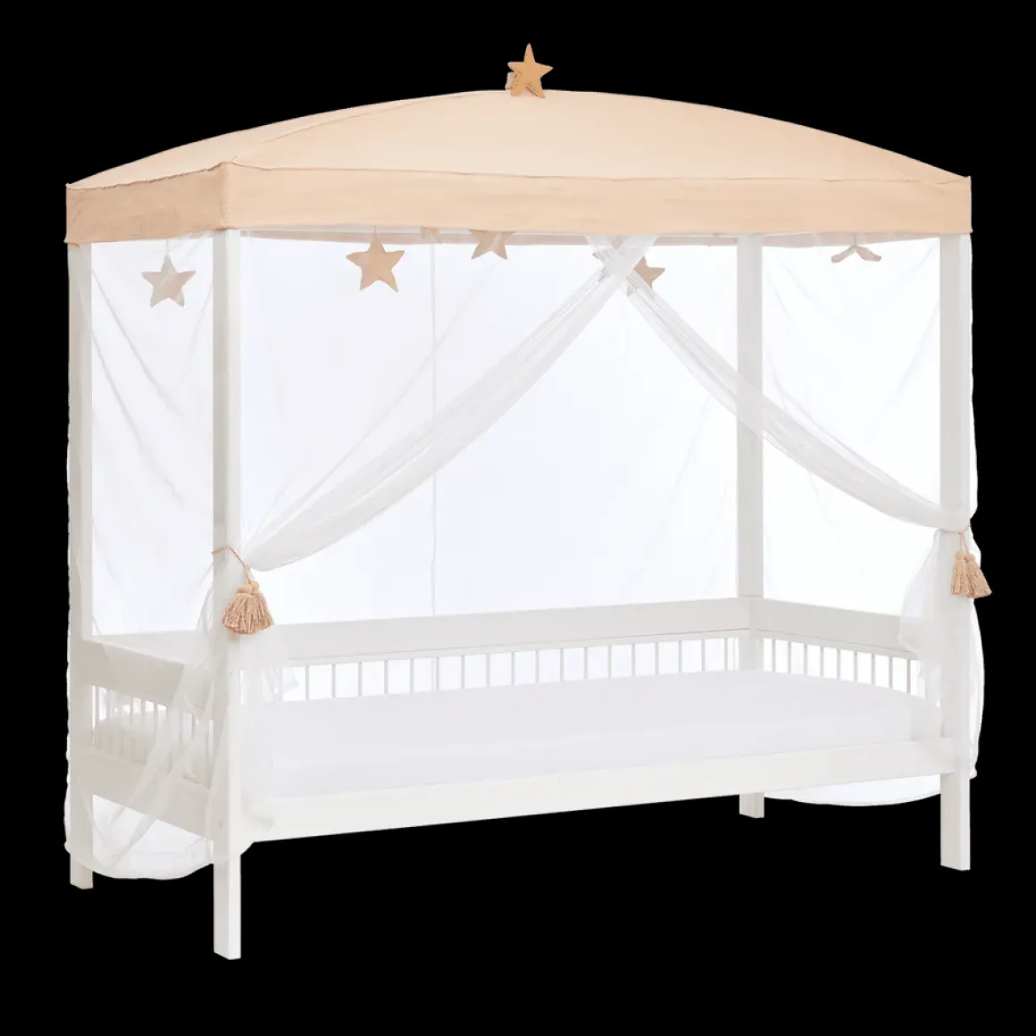 De Fairy Theatre hemel wordt geleverd met een stervormige top en speelse hangers in de vorm van sterren en libellen. Deze details maken de hemel een echte blikvanger in de kamer en nodigen uit tot fantasierijk spel en ontspanning. De royale afmetingen van 210x210x210 cm zorgen ervoor dat de hemel een ruimtelijk en luchtig effect geeft, terwijl hij tegelijkertijd een intieme sfeer creëert rond het bed.