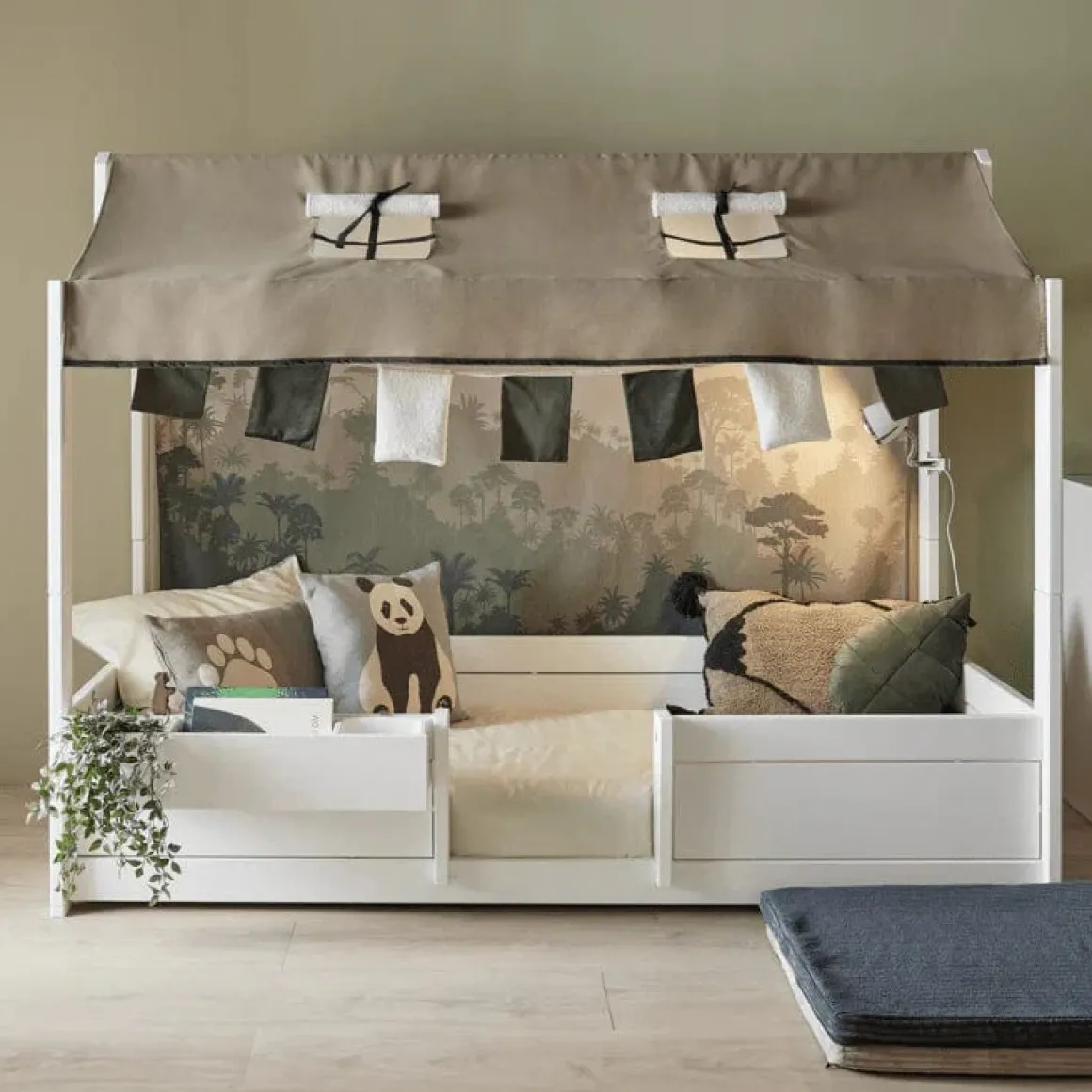 Het Panda Paradise thema zorgt voor een rustgevende en kindvriendelijke uitstraling met speelse elementen die kinderen uitnodigen tot creatief spel. Het stoffen dakje is voorzien van teddy raamdetails en wordt geleverd met een vrolijke slinger.