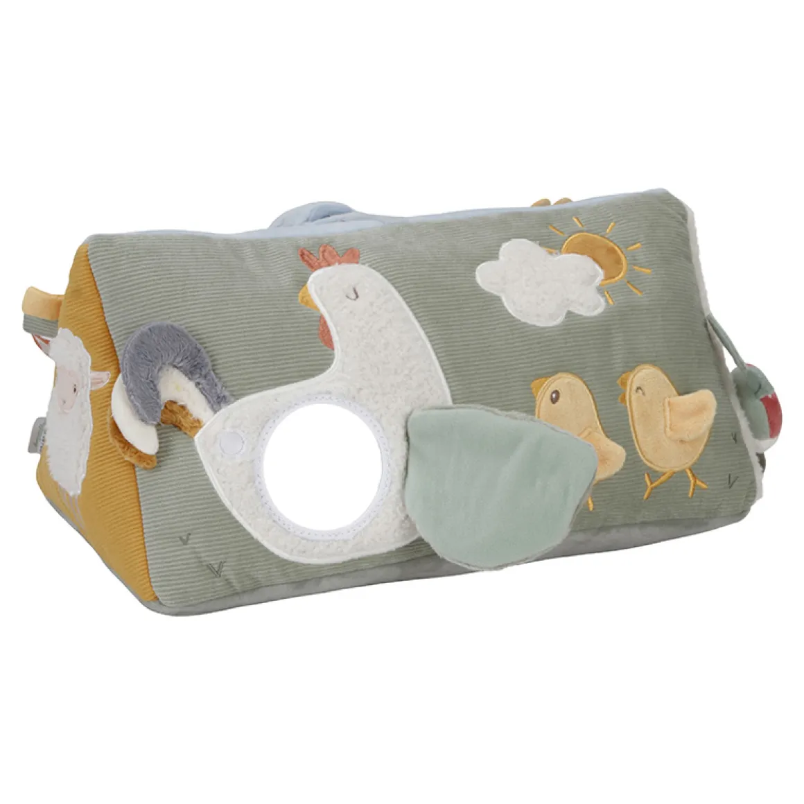 De driehoek zelf is divers opgemaakt. Op de Little Dutch Activiteitendriehoek Little Farm valt er veel te ontdekken. Van knisperende vleugels van de kip tot aan een spiegeltje en een rammelende gieter. De driehoek heeft speelse functies en leuke texturen die de zintuigen en verbeeldingskracht van je baby prikkelen.