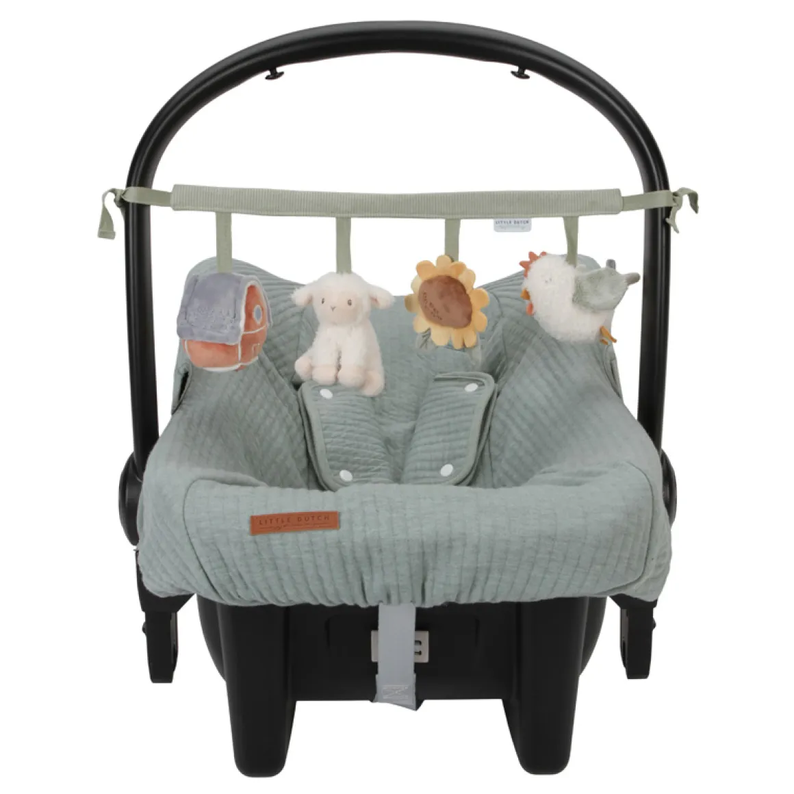 De Little Dutch Autostoelspeeltje Little Farm met de vriendjes van de boerderij is eenvoudig te bevestigen aan een autostoeltje of kinderwagen en zorgt onderweg voor veel speelplezier en vermaak dankzij de speeltjes met een rammelaar, spiegeltje, knijp toetertje en knisper. Het autospeeltje stimuleert tevens de hand-oogcoördinatie.