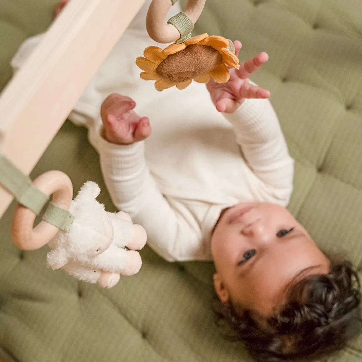 De babygym wordt geleverd met drie betoverende activiteitenspeeltjes: een vrolijk schaapje, een kleurrijke bloem en een lief kippetje. Deze speeltjes dagen je baby uit om te grijpen, voelen en ontdekken, waardoor de ontwikkeling van de oog-handcoördinatie en motorische vaardigheden wordt gestimuleerd.