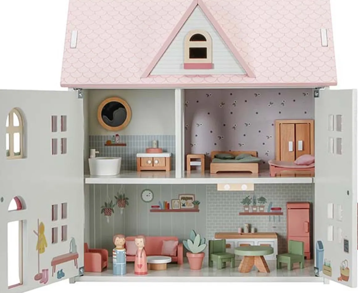 Het poppenhuis is gemaakt van FSC-gecertificeerd hout, wat duurzaamheid en veiligheid waarborgt.
