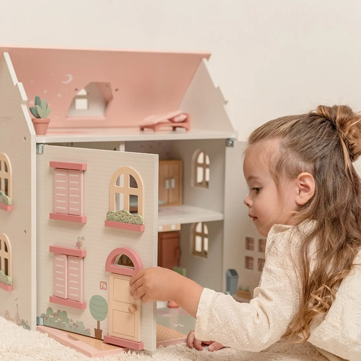 Het poppenhuis is uitgevoerd in een witte kleur met een roze dak en voorzien van houten luiken die open en dicht kunnen. Het dak kan worden geopend, en een deel ervan kan worden omgetoverd tot een tuin, waardoor extra speelplezier ontstaat.